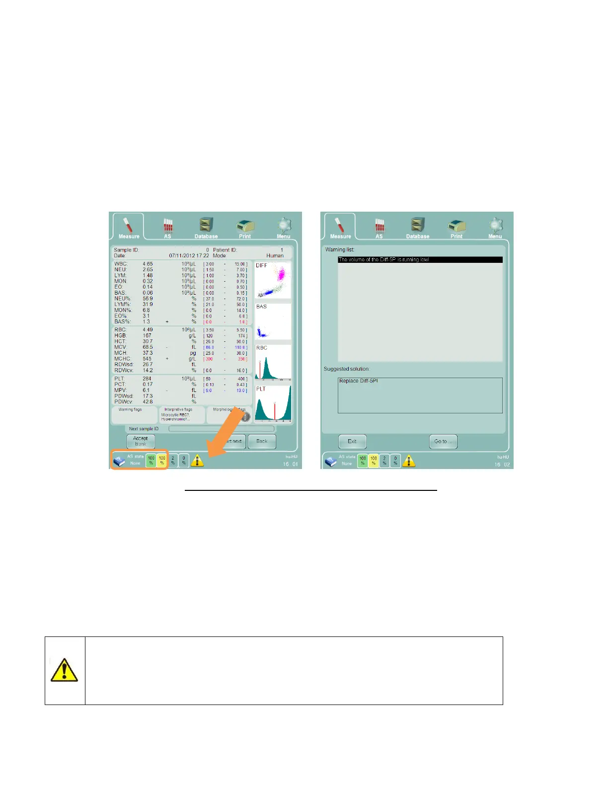 warns the operator when a reagent is about to run out. An exclamation mark within a yellow triangle will be