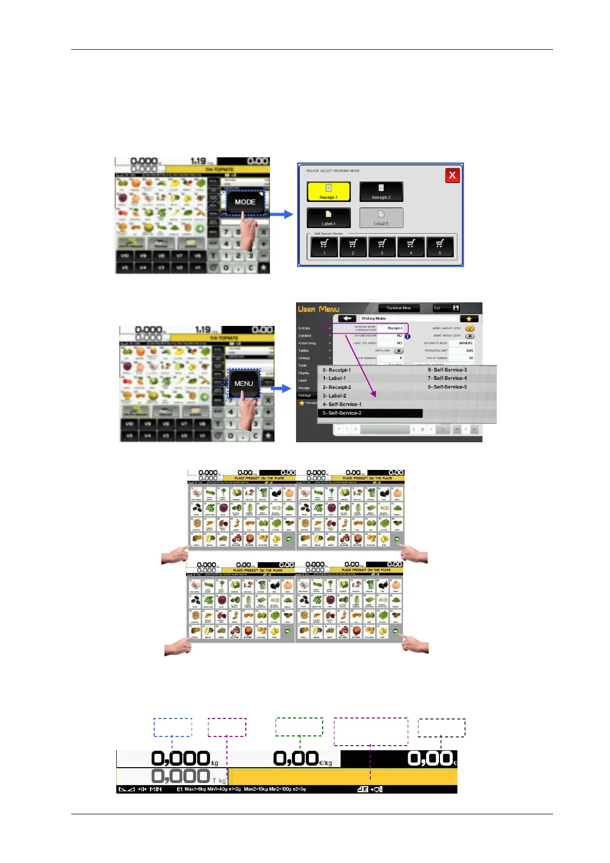 Depending on the working mode selected, the scale has several sales screens with the key layout and