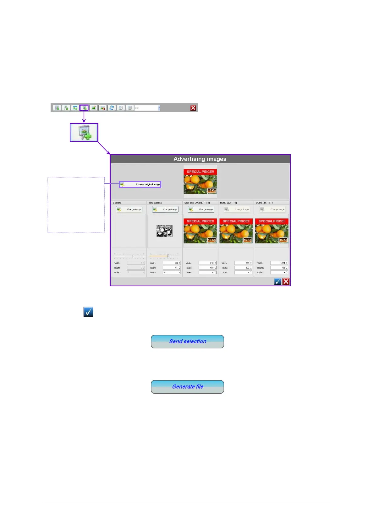 To send an image to the scale, select it in the list and click on Send Selection