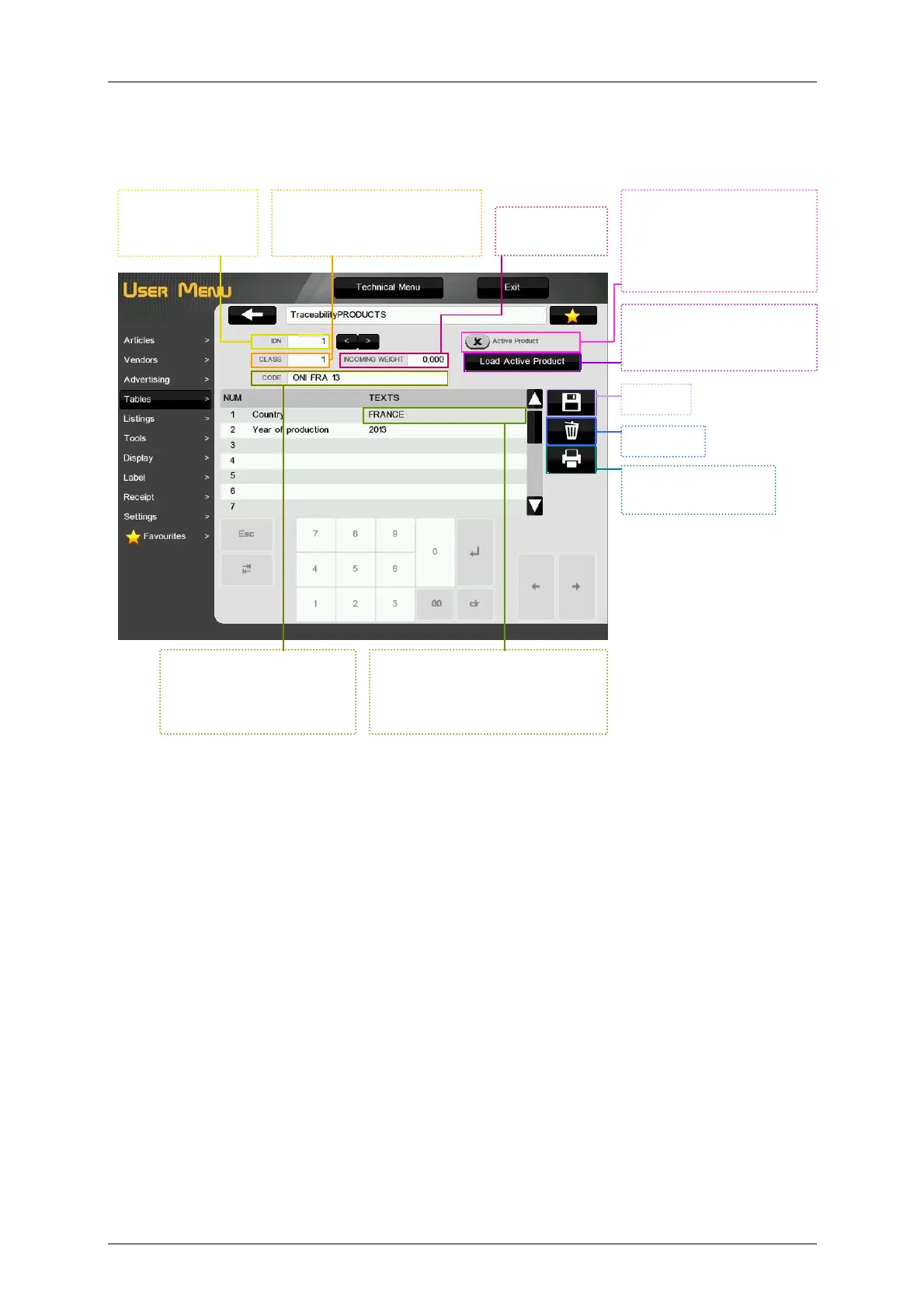 To program a product, select Tables Traceability Products. The scale will show the following