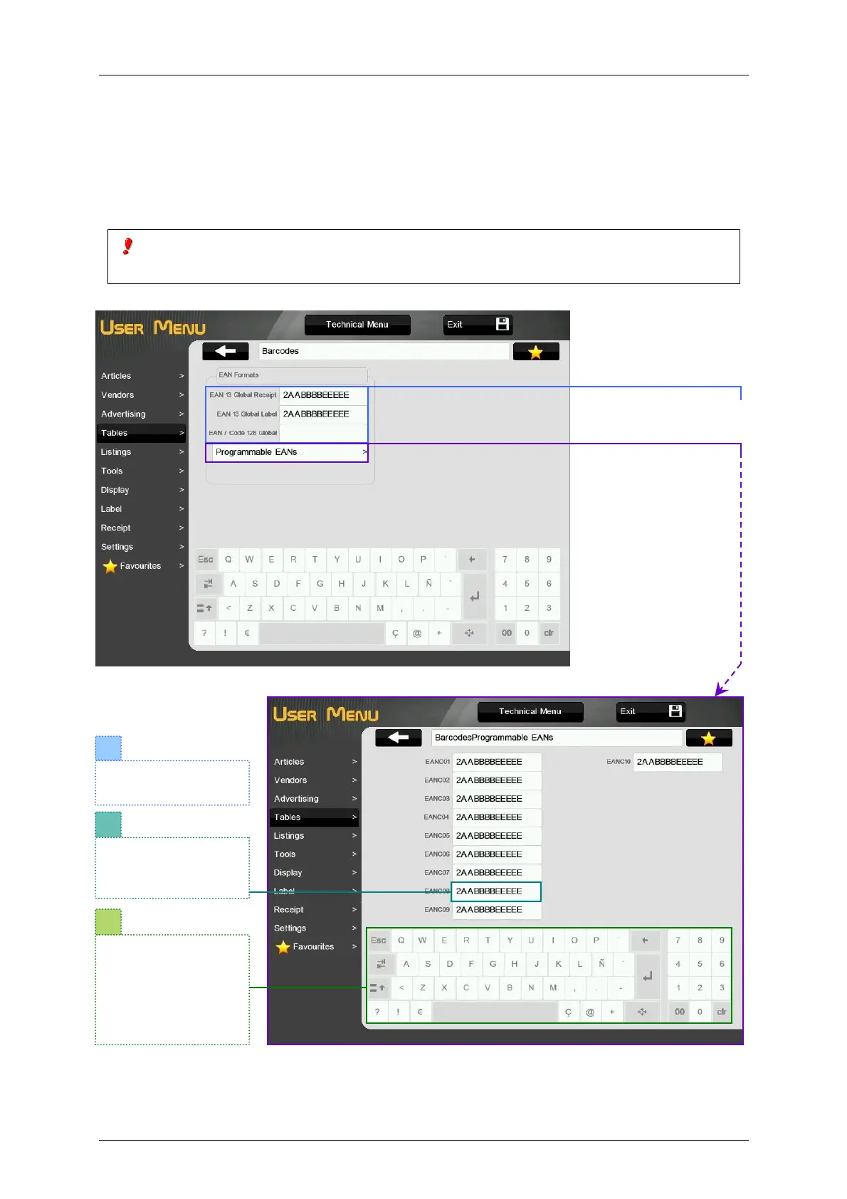 This is the menu to program the barcodes: Global EAN13 (receipt and label) and Global EAN128 and the