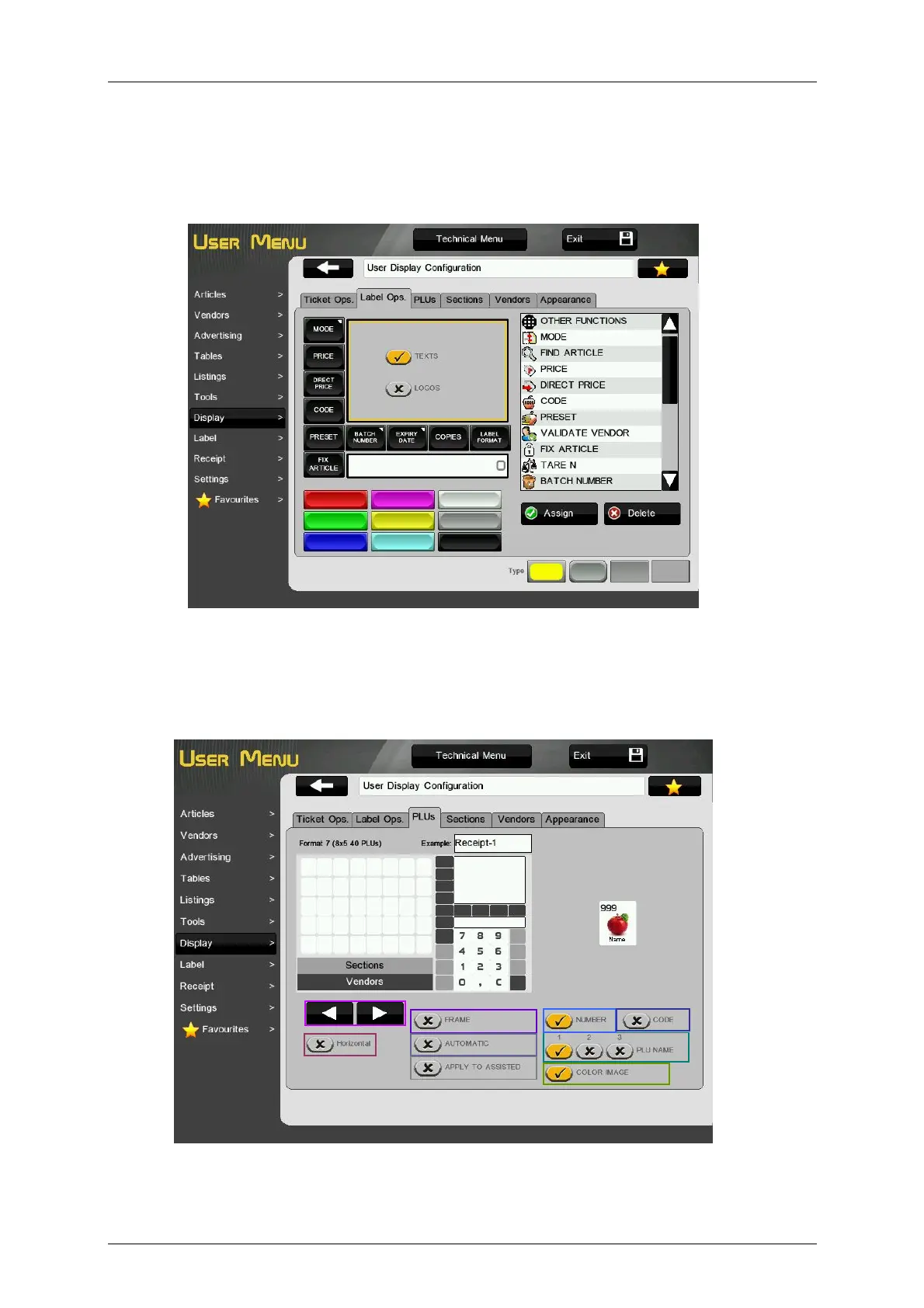 This menu allows to configure the design of the PLU keys. The configuration is different for Receipt-