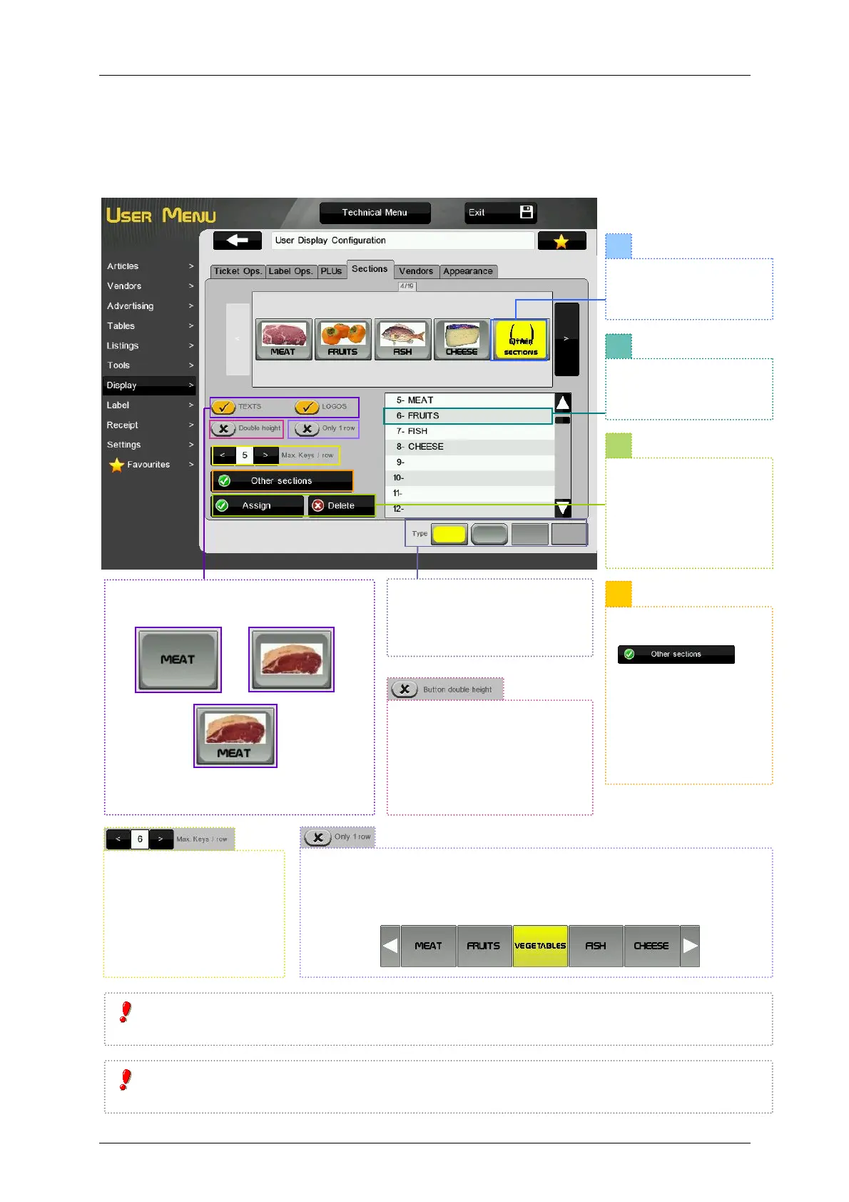 This menu allows to select the section keys to be shown and configure these keys. It is possible to show a