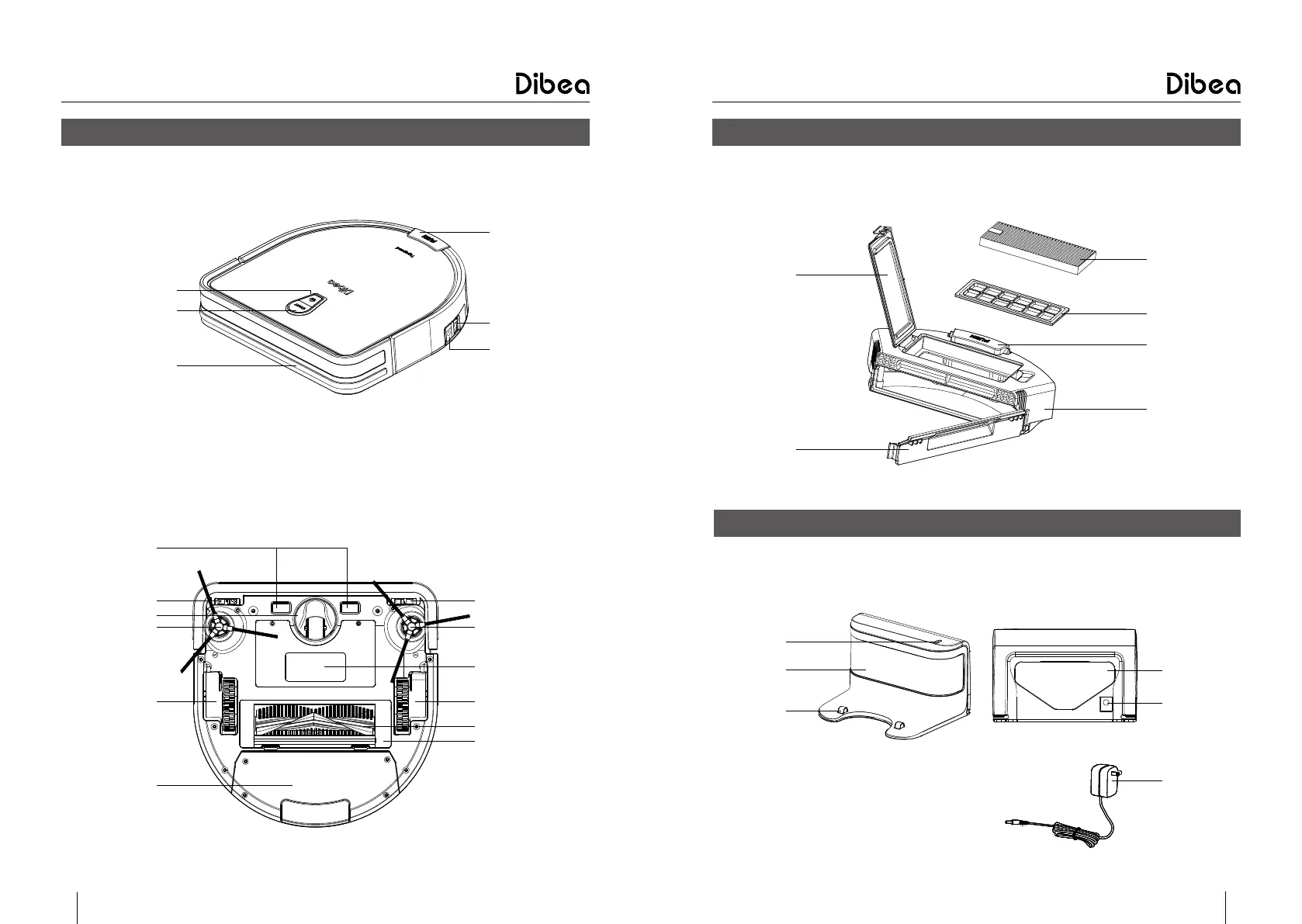 dibea D960 - Product Components; Main body; Dust bin; Charging base and accessories