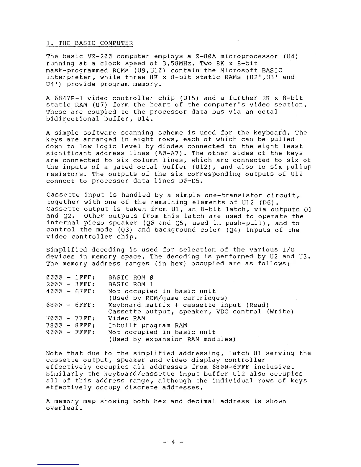 The basic VZ-200 computer employs a Z-80A microprocessor (U4)