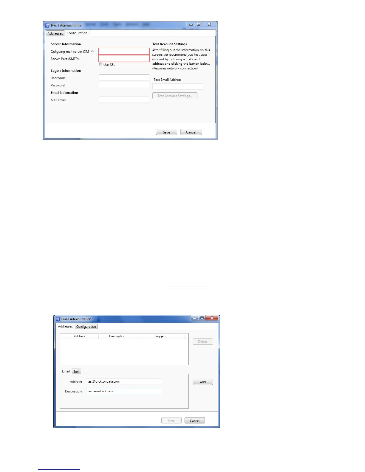 d. Email Information: Email address of text name used to populate the From field in the alarm