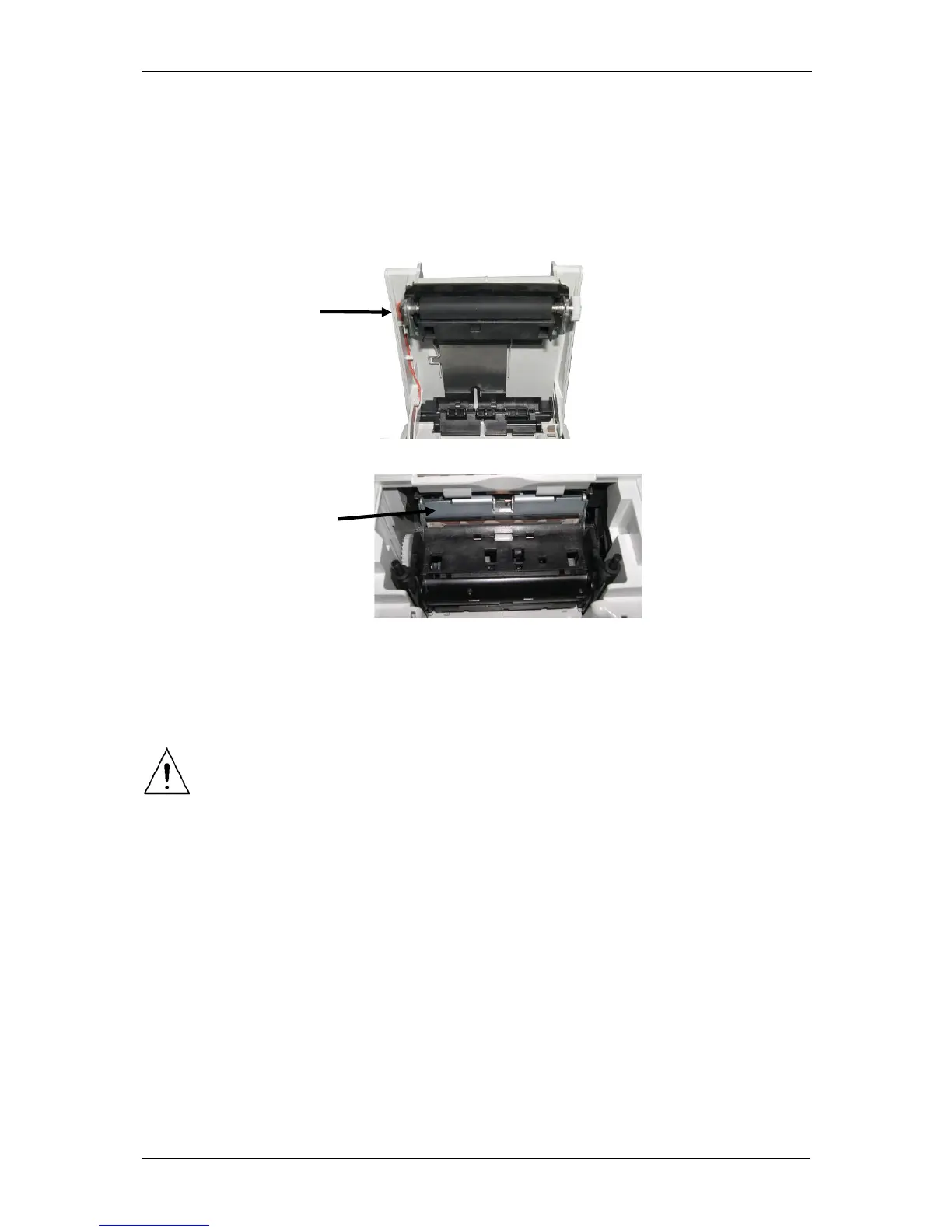 Open the printer cover and remove the paper roll; the rubber roller and the print head