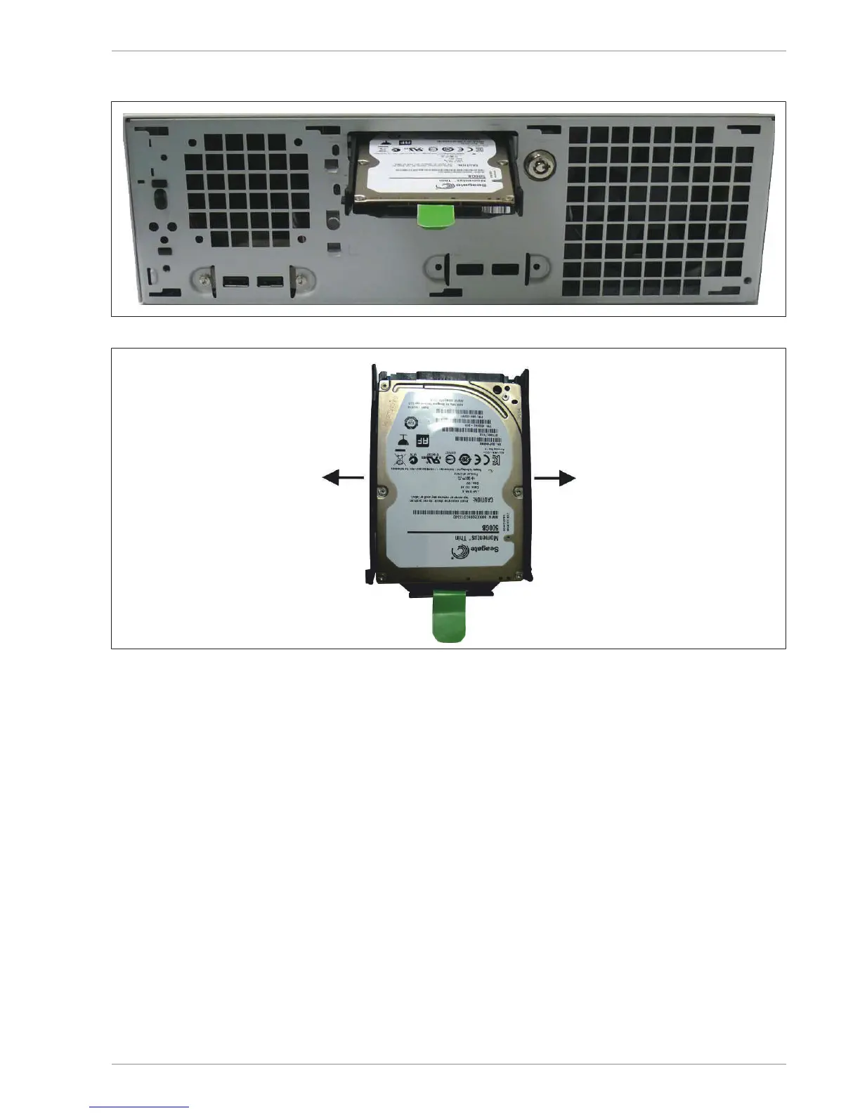 Pull on the green belt to remove the carrier together with the hard disk.