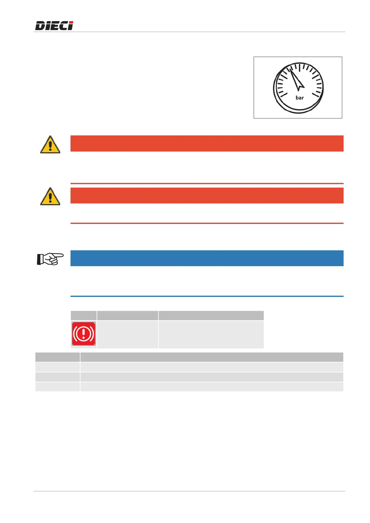 In the case of low pressure (below 18 bar) stop the machine and contact an authorized Dieci dealer to