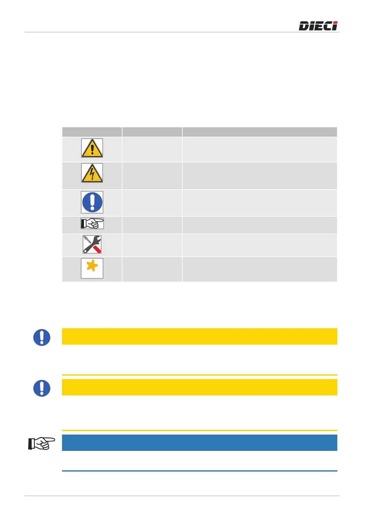The symbols listed below are inserted to highlight situations which DIECI S.R.L. considers particularly
