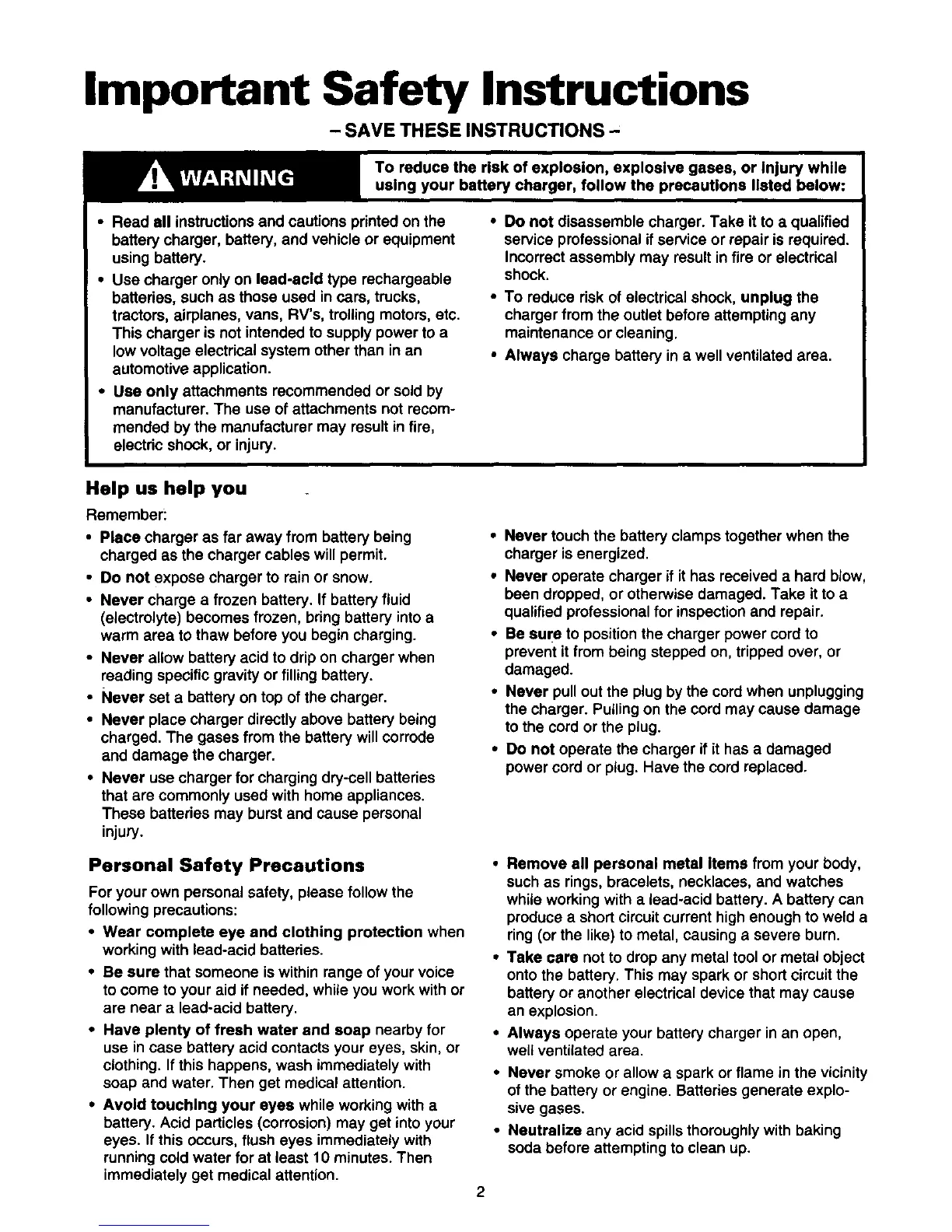 • Never allow battery acid to drip on charger when