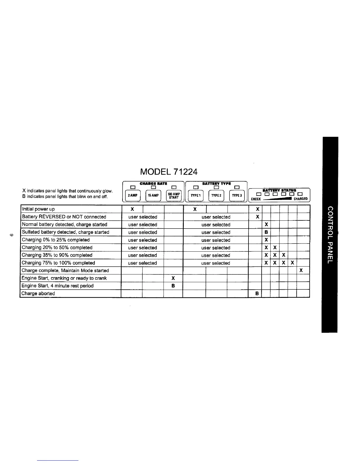 X indicates panel lights that continuously glow.