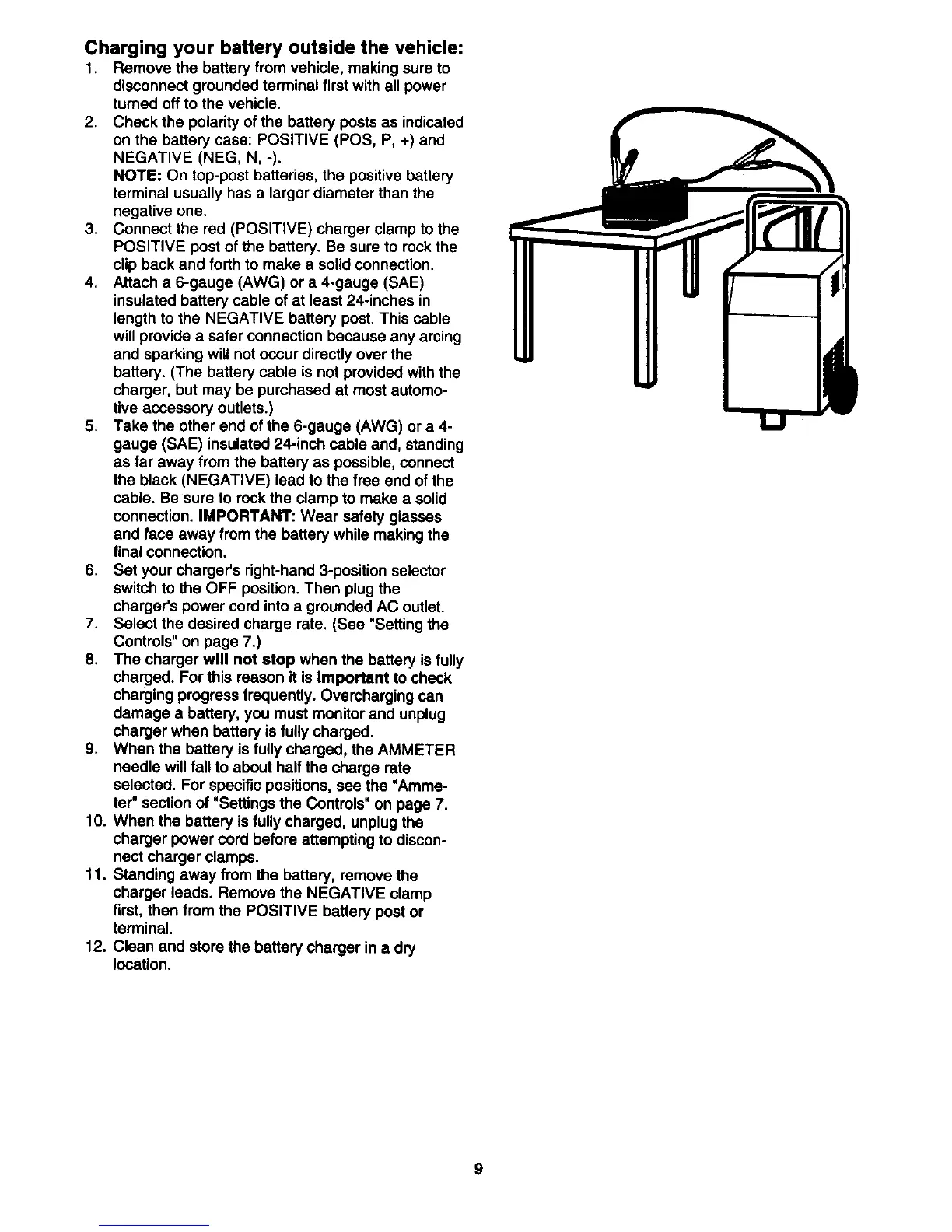 charger leads. Remove the NEGATIVE clamp