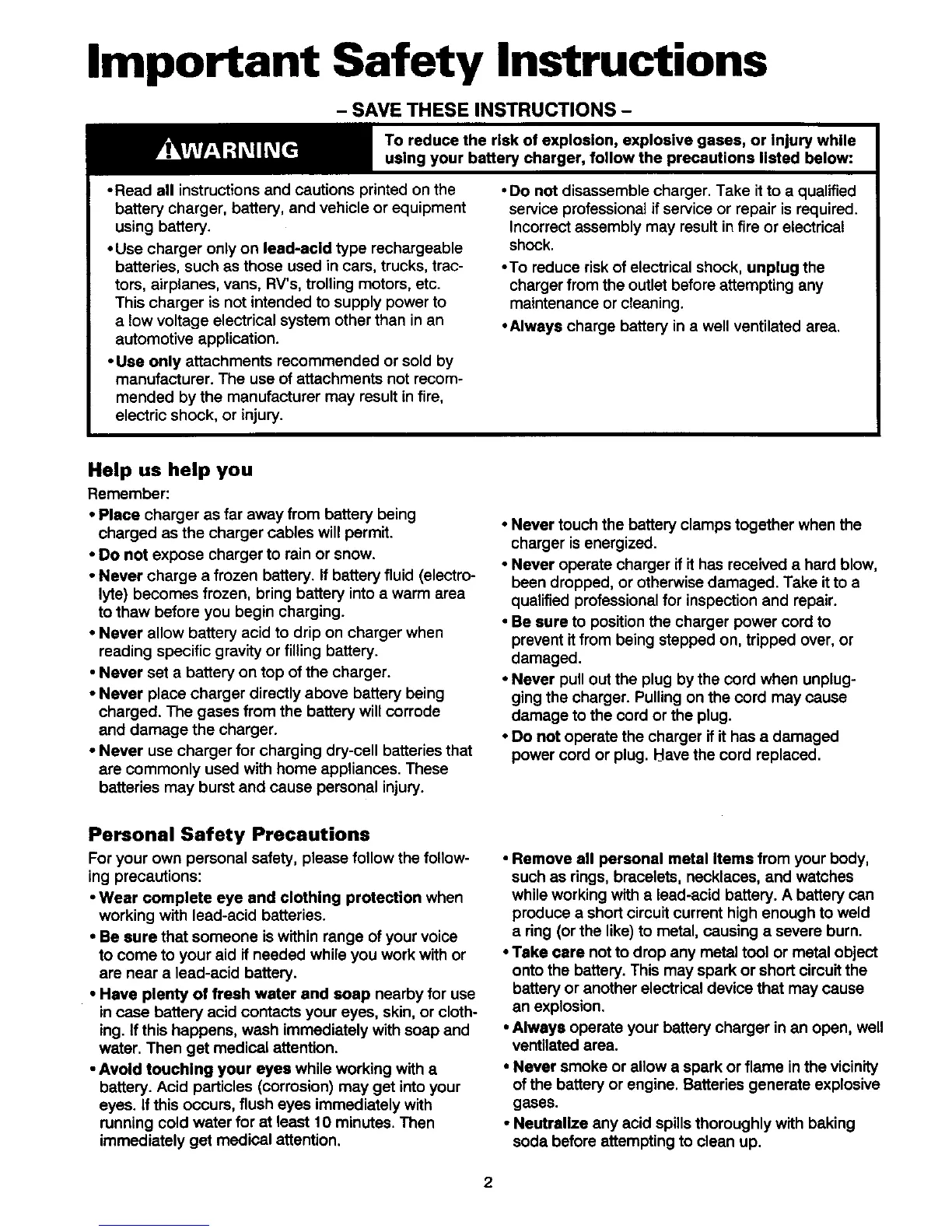 • Never allow battery acid to drip on charger when