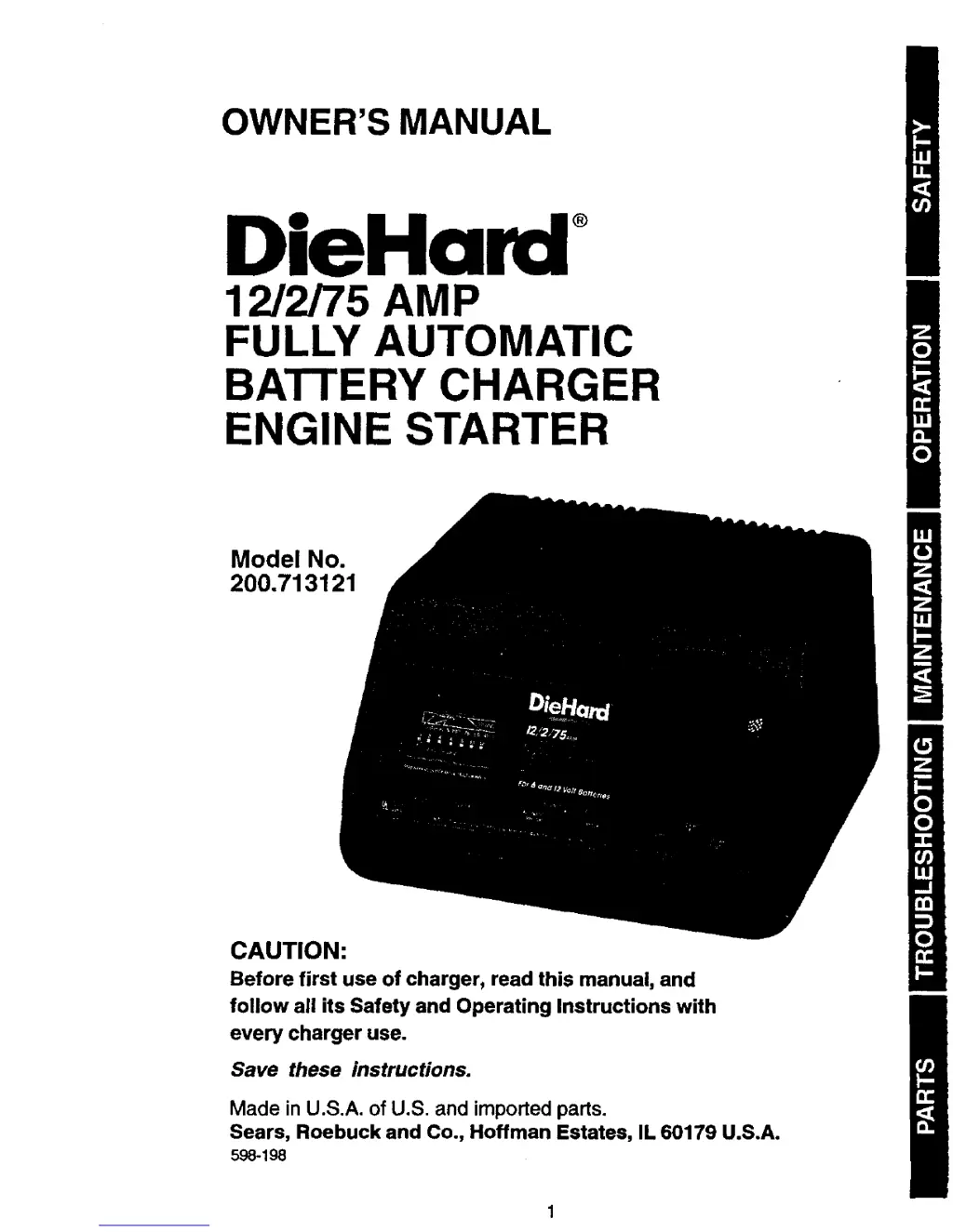 If the DieHard Battery Charger's circuit breaker cycles on and off with a clicking sound while in the MANUAL setting, it could be due to shorted battery clamps, a shorted battery, or reversed charger leads on the battery. First, separate the clamps. This cycling indicates that the current draw is too high. Inspect the cables for wear and replace them if necessary. A Sears technician can test the battery for shorts. Ensure that the connections are correctly made.