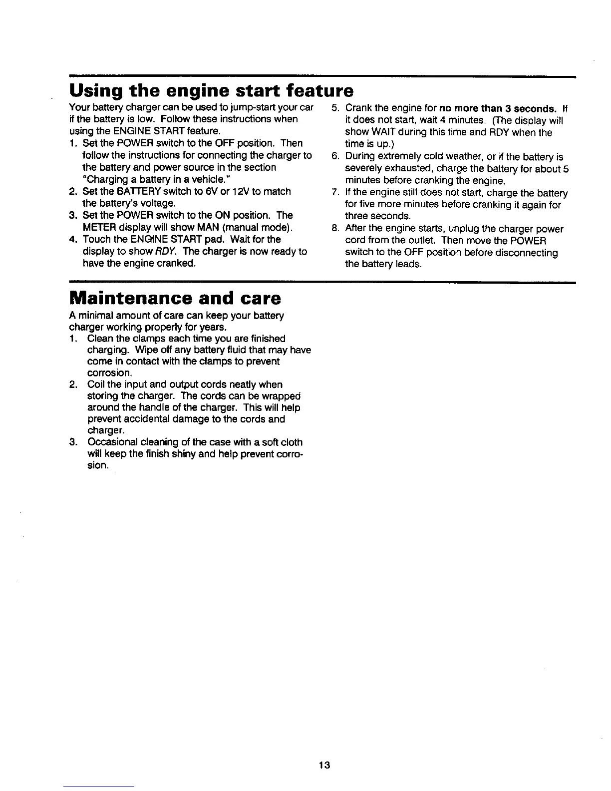 Your battery charger can be used to jump-start your car 5, Crank the engine for no more than 3 seconds. If