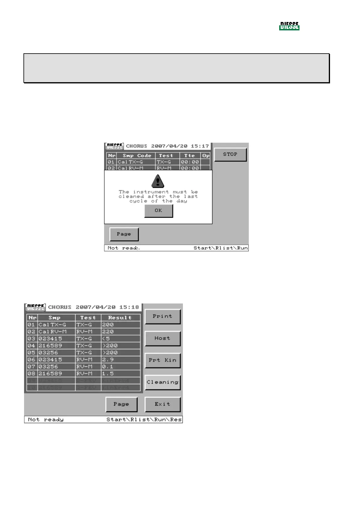 At the end of the cycle a message box notifies the operator it is necessary to execute a washing at the