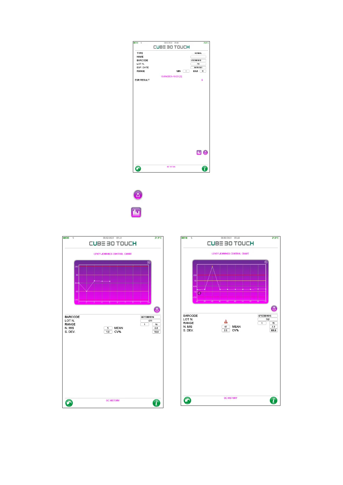 This page shows the details of the QC (barcode, lot and limits), the number of