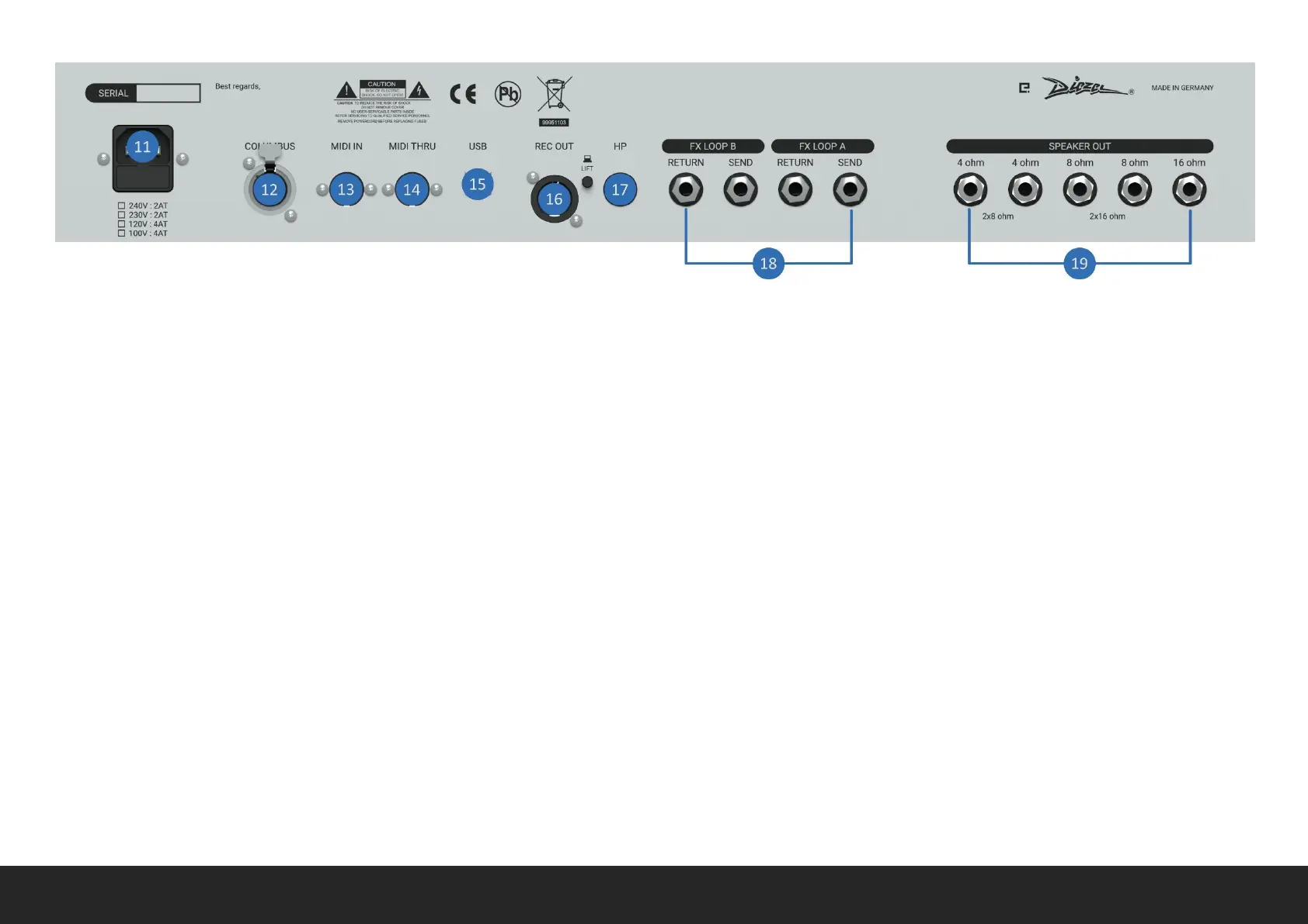19 SPEAKER OUT Connect your CABINET(s) here. Make sure that the