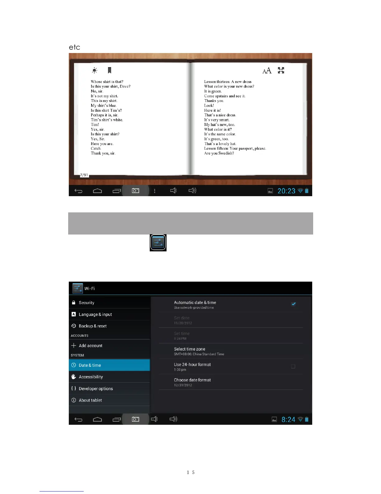 Battery, Accounts &sync, security, language, date&time, about tablet,
