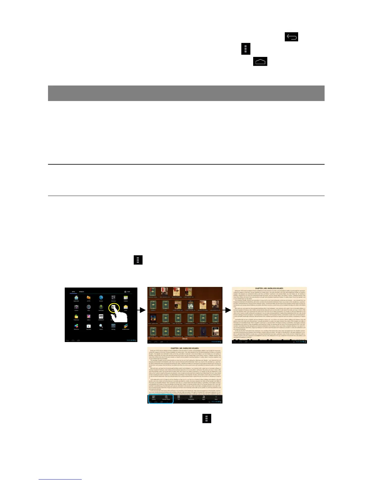 (1) Open the app E-Book, then select one e-book from the local library and tap to