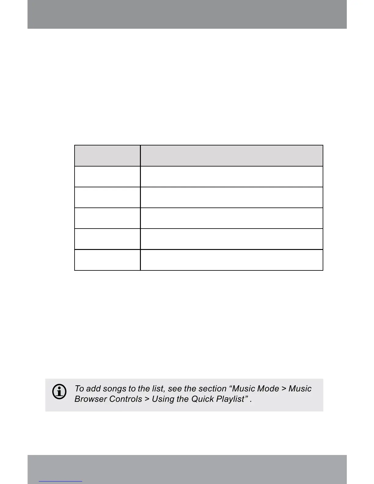 To add songs to the list, see the section “Music Mode > Music