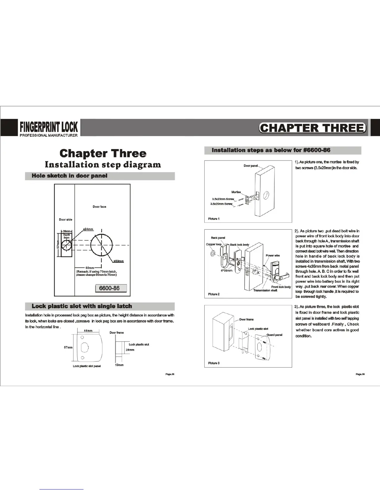 Digi 6600-86 - Installation of Fingerprint Locks; Door Panel Hole Sketch; Lock Plastic Slot Installation