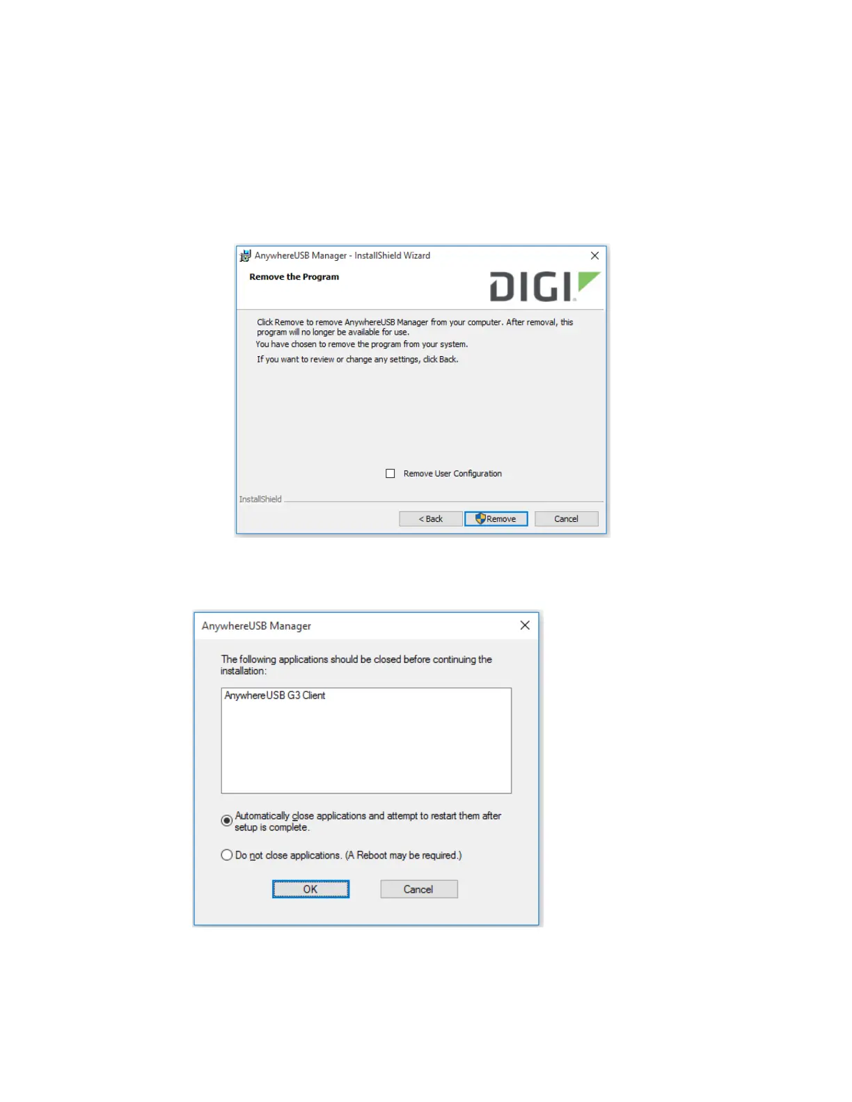 7. Click Remove. If the AnywhereUSBManager is open, the following dialog displays. Do not