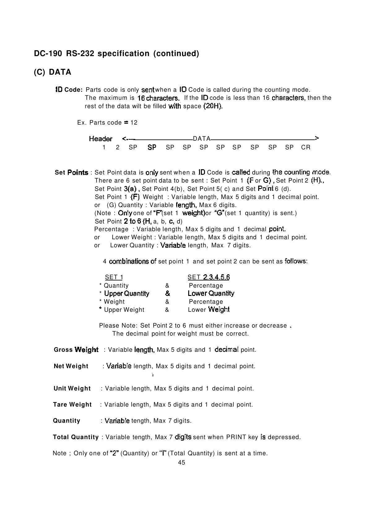 Tare Weight : Variable length, Max 5 digits and 1 decimal point.