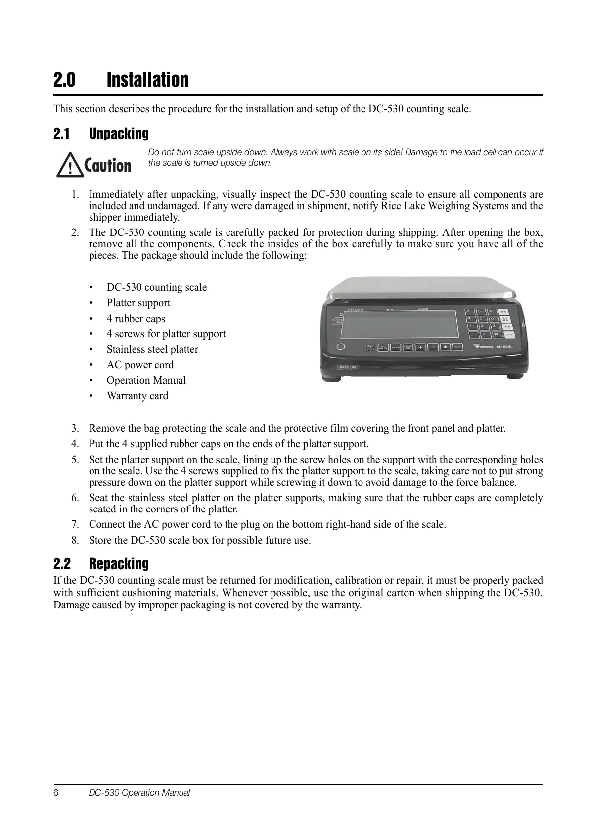 1. Immediately after unpacking, visually inspect the DC-530 counting scale to ensure all components are