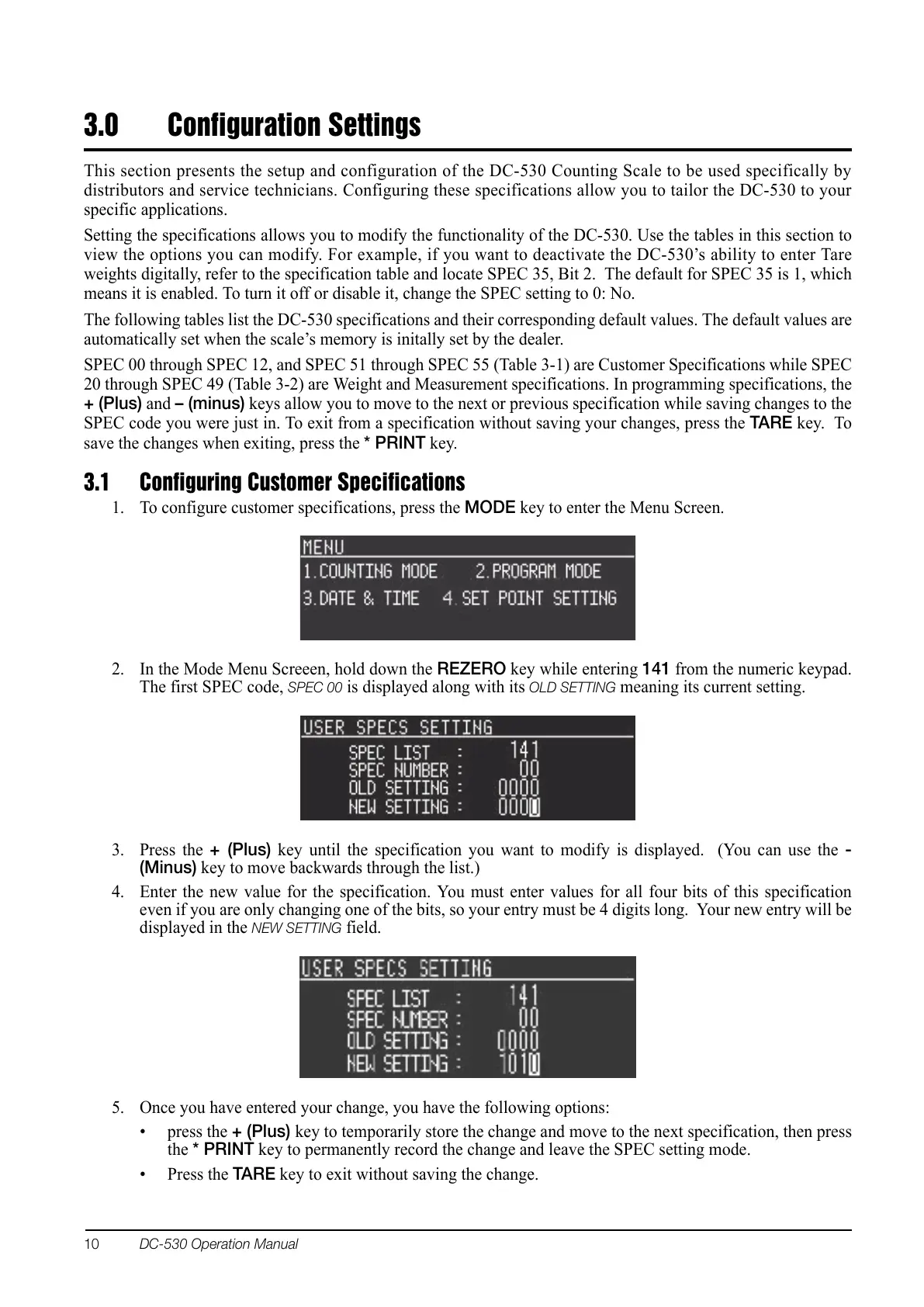 Setting the specifications allows you to modify the functionality of the DC-530. Use the tables in this section to