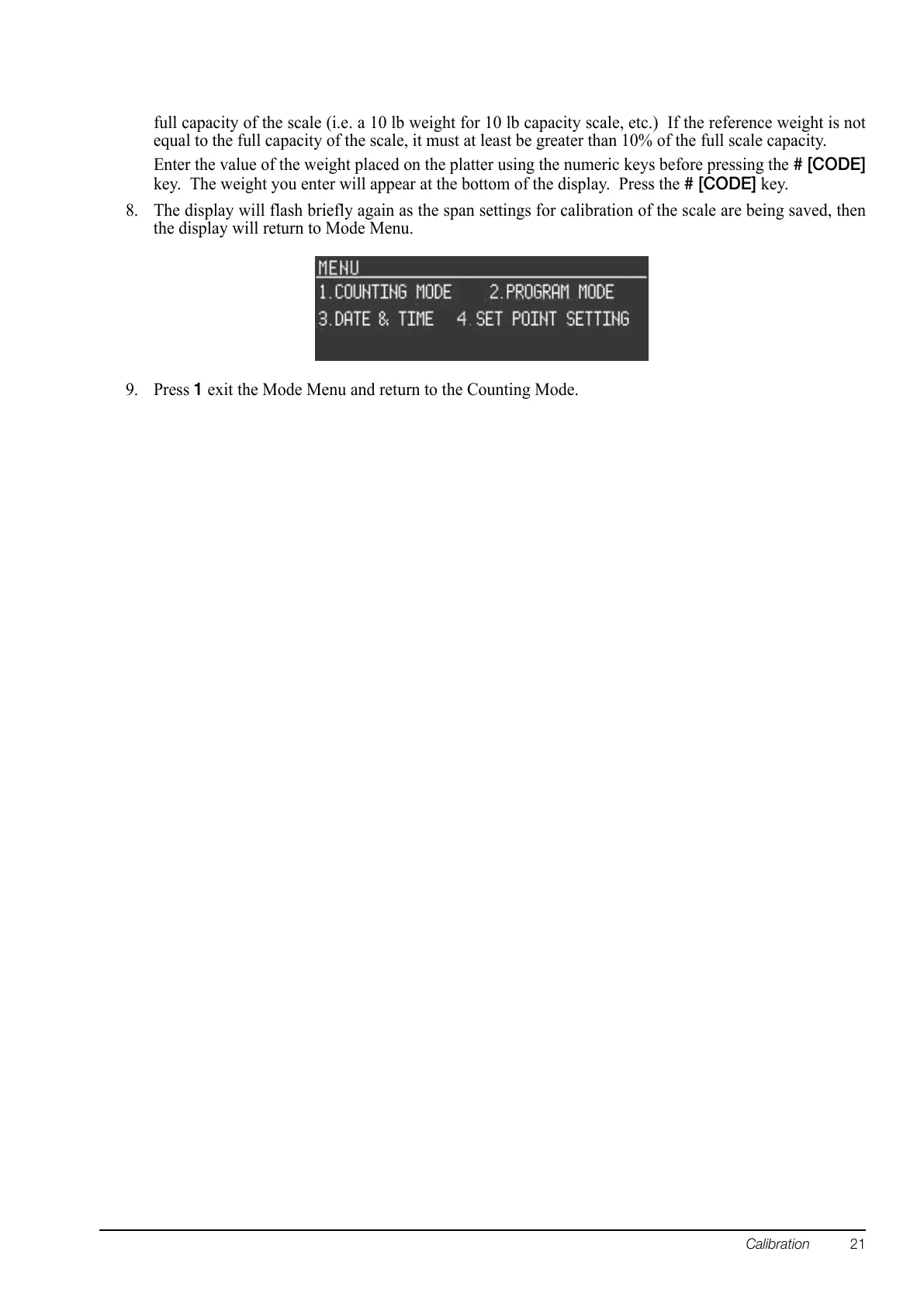 8. The display will flash briefly again as the span settings for calibration of the scale are being saved, then