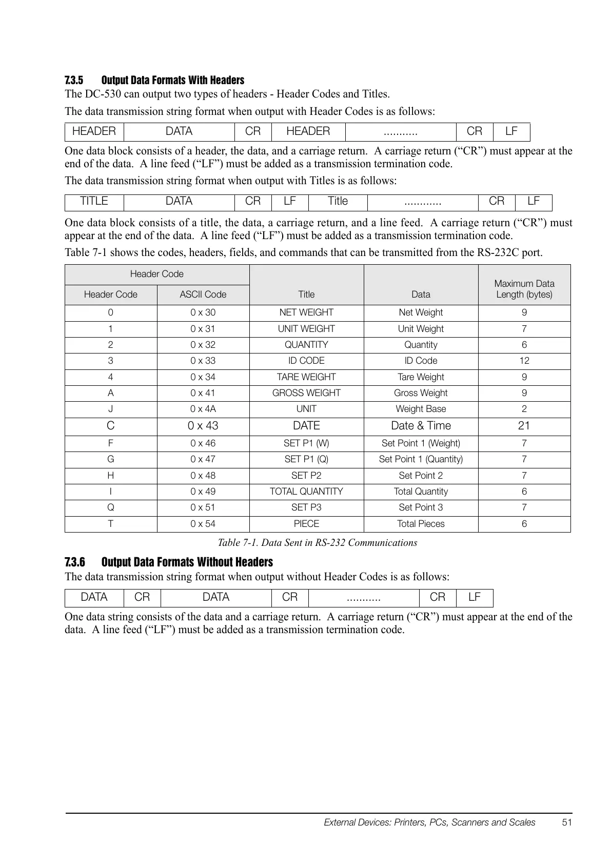 Table 7-1 shows the codes, headers, fields, and commands that can be transmitted from the RS-232C port.