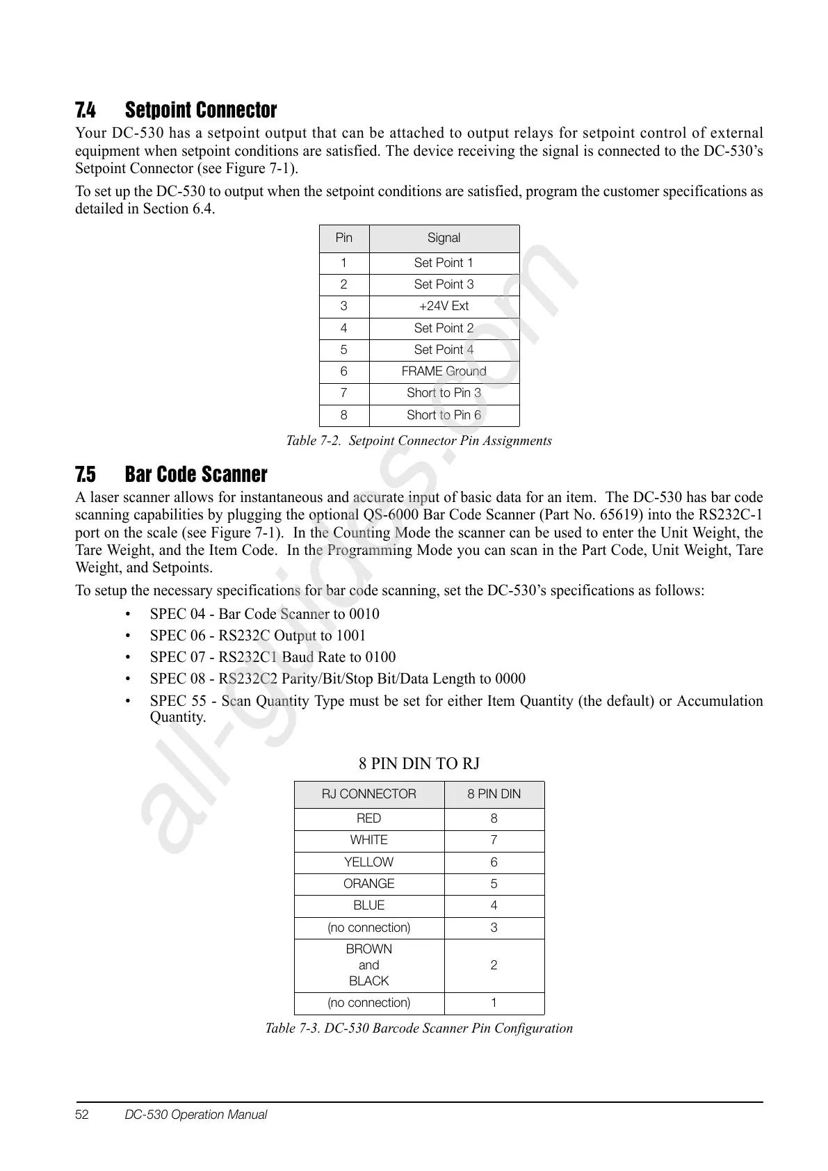 Table 7-3. DC-530 Barcode Scanner Pin Configuration