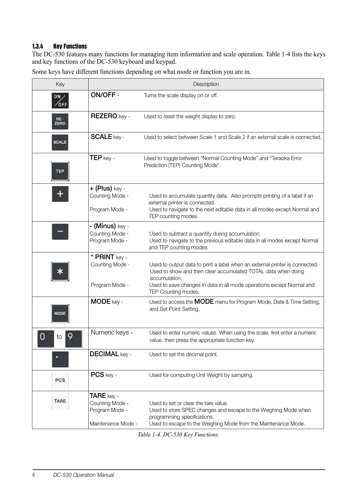 The DC-530 features many functions for managing item information and scale operation. Table 1-4 lists the keys