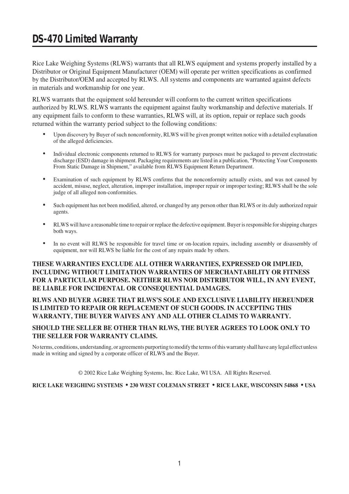 Rice Lake Weighing Systems (RLWS) warrants that all RLWS equipment and systems properly installed by a