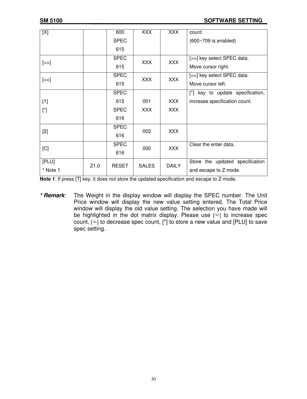 Note 1: If press [T] key, it does not store the updated specification and escape to Z mode.