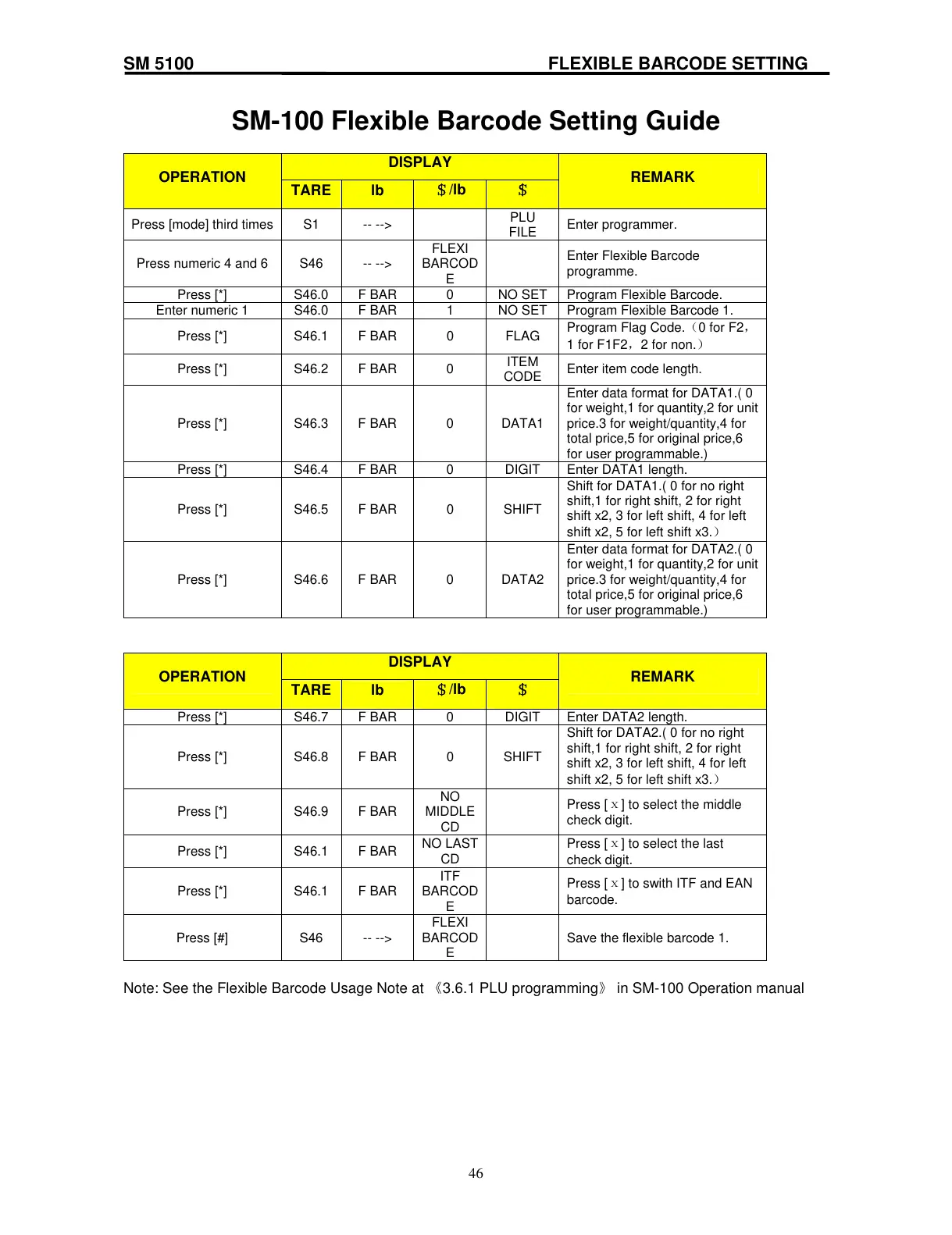 Enter numeric 1 S46.0 F BAR 1 NO SET Program Flexible Barcode 1.