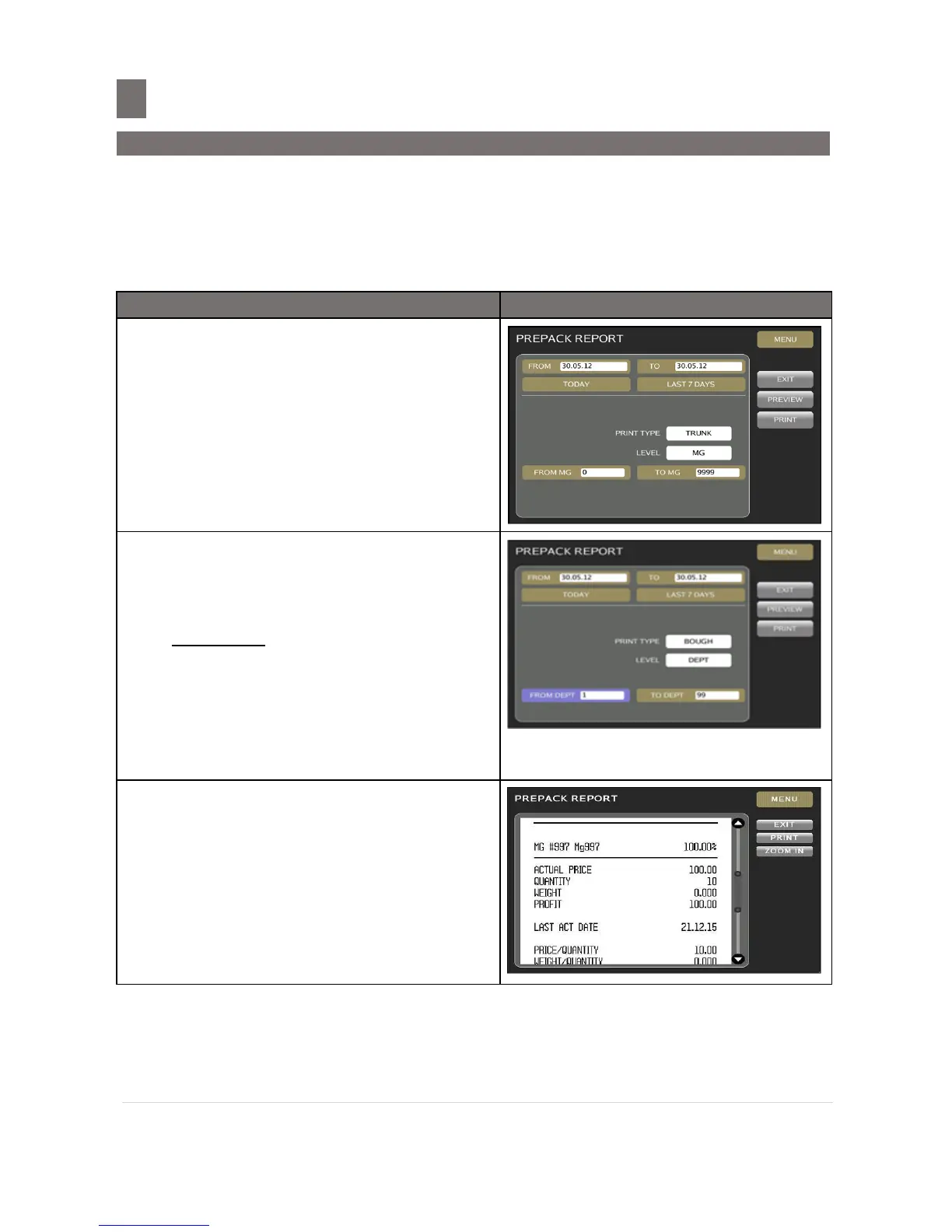 Prepack Report, Sales transaction report is printed depending on the date range selection.