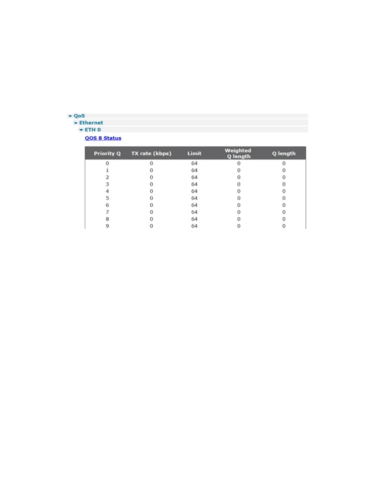 The Ethernet QoS status pages display the current Quality of Service (QoS) status table for a