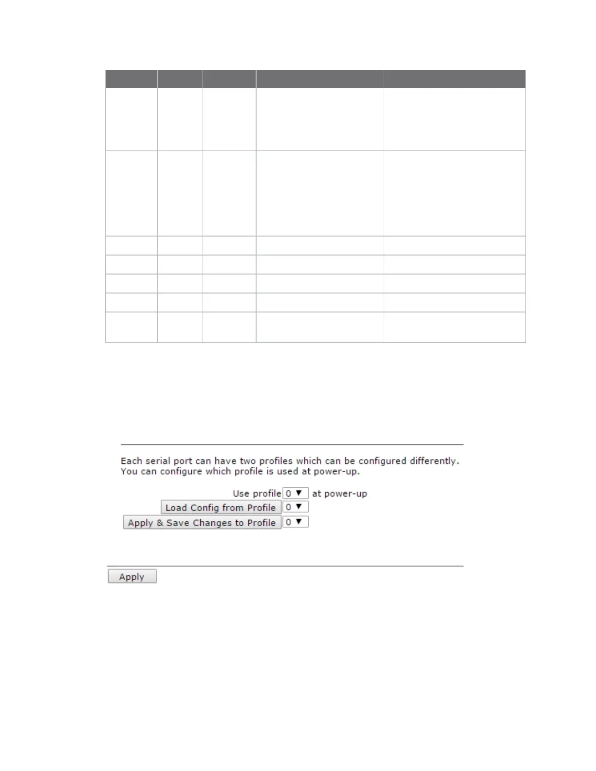 Each serial port can have two profiles which can be configured differently. The Profiles settings select