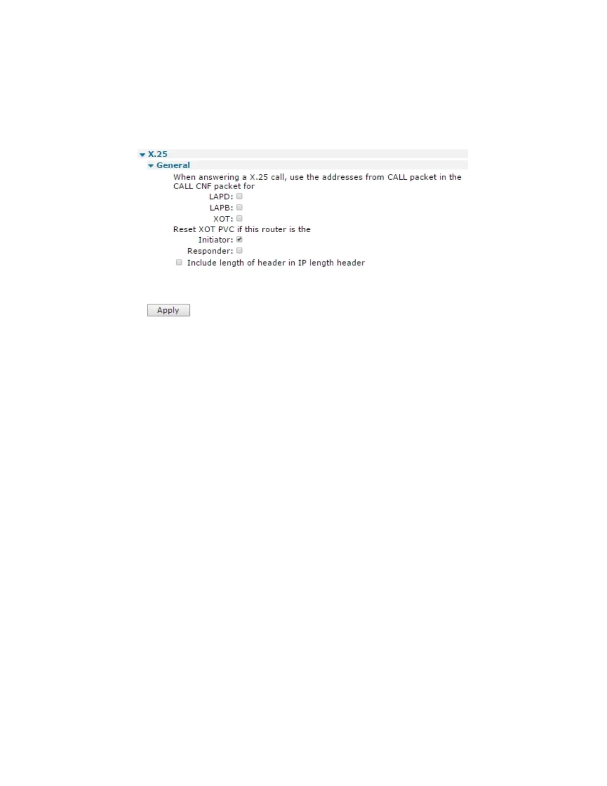 1. Go to Configuration > Network > Legacy Protocol > X.25 > General.