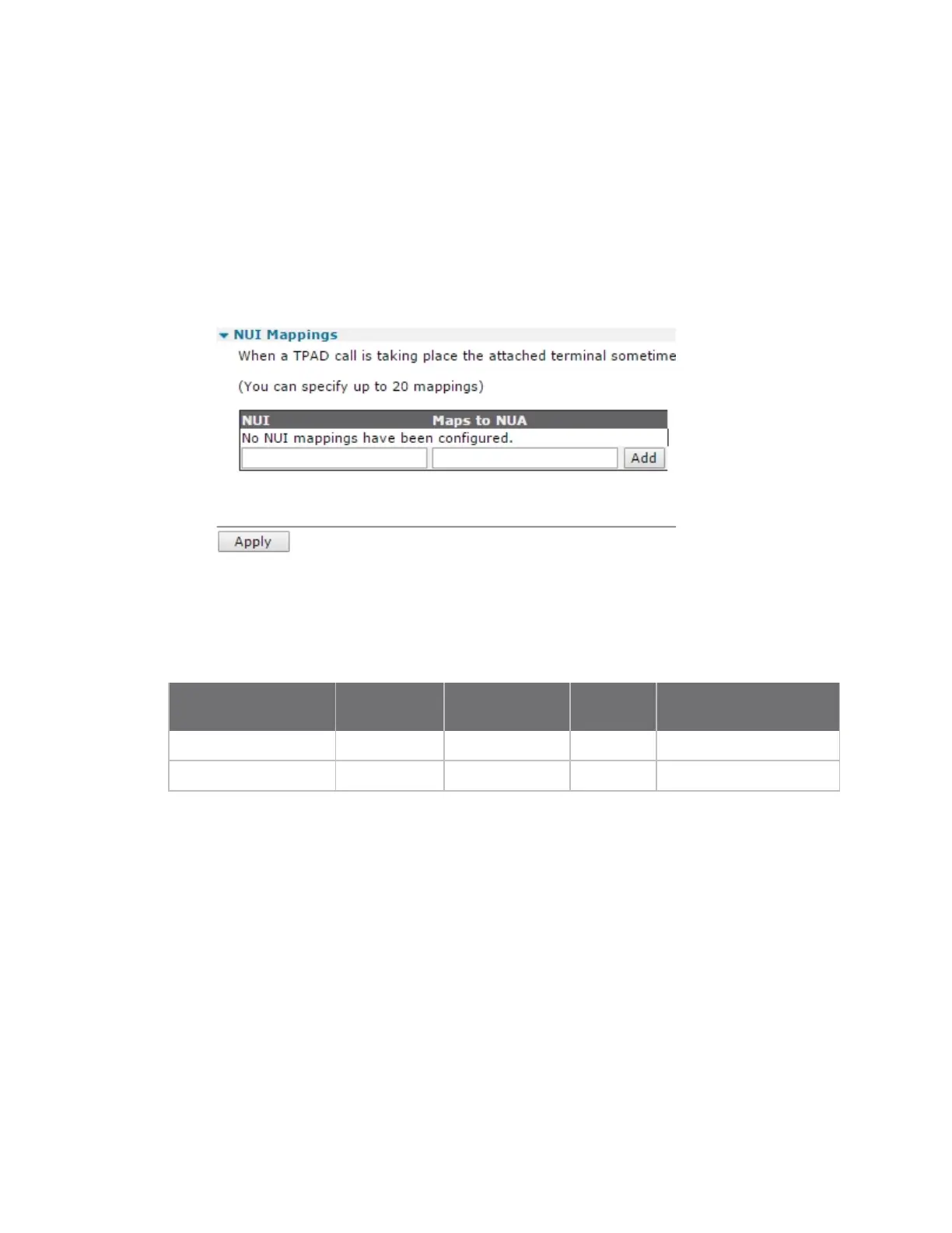 1. Go to Configuration > Network > Legacy Protocol > X.25 > NUI Mappings.