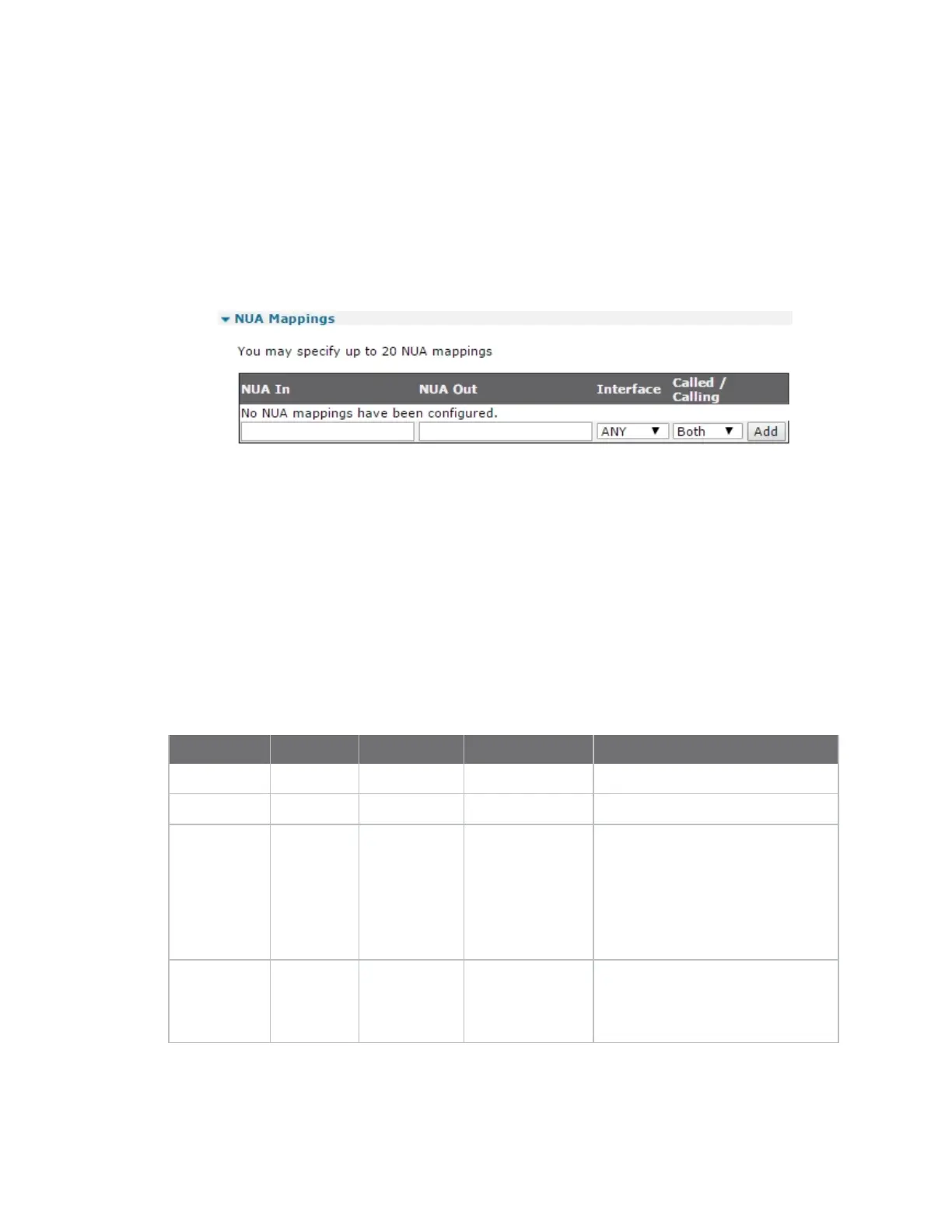 X.25 calls. Up to 20 NUA In to NUA Out mappings are available. These mappings alter the called NUA
