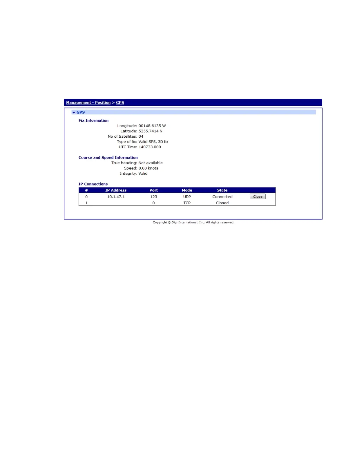 The GPS page displays a summary of the most recent information received from the GPS module (if