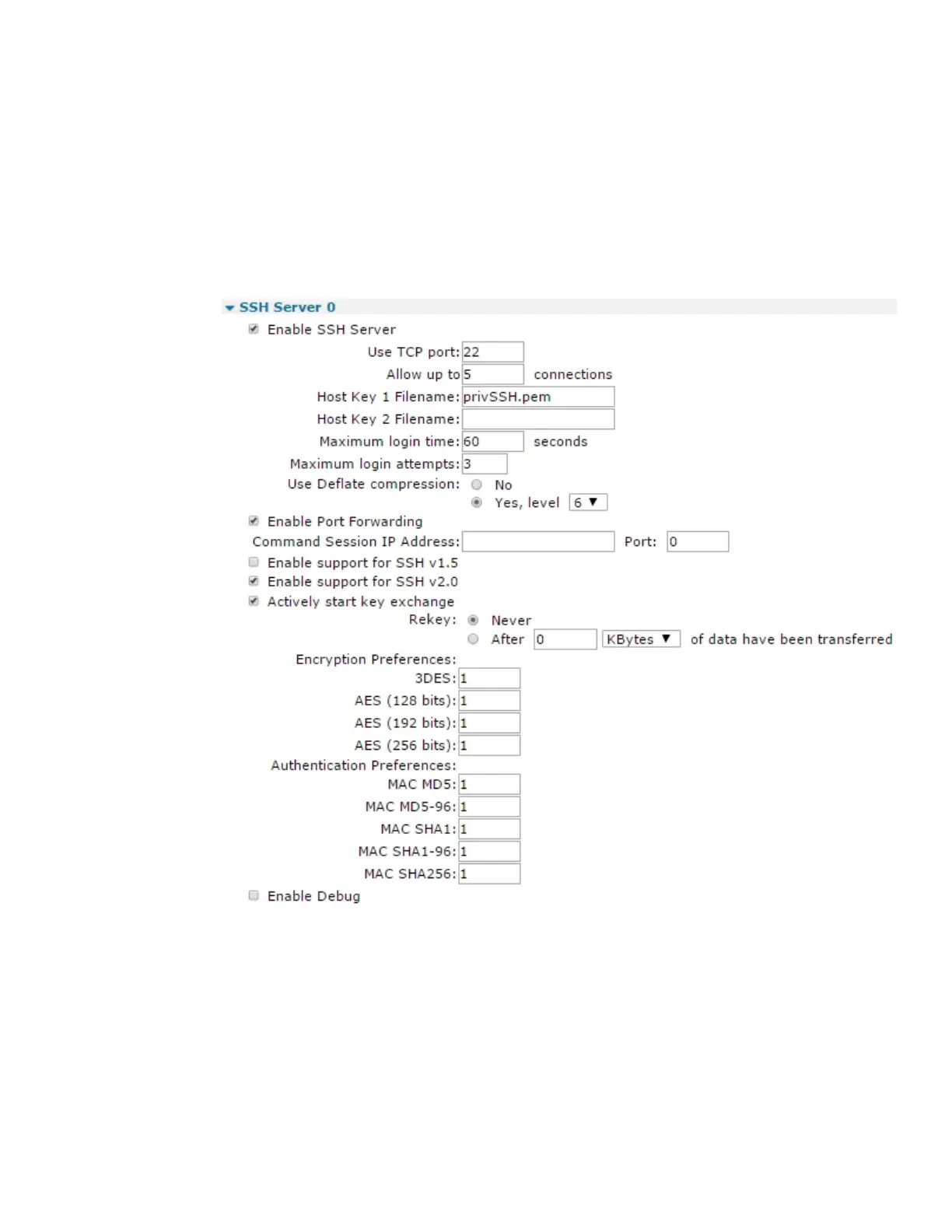 2. Click Enable SSH Servers to enable use of SSHfor the router. The SSH server parameters