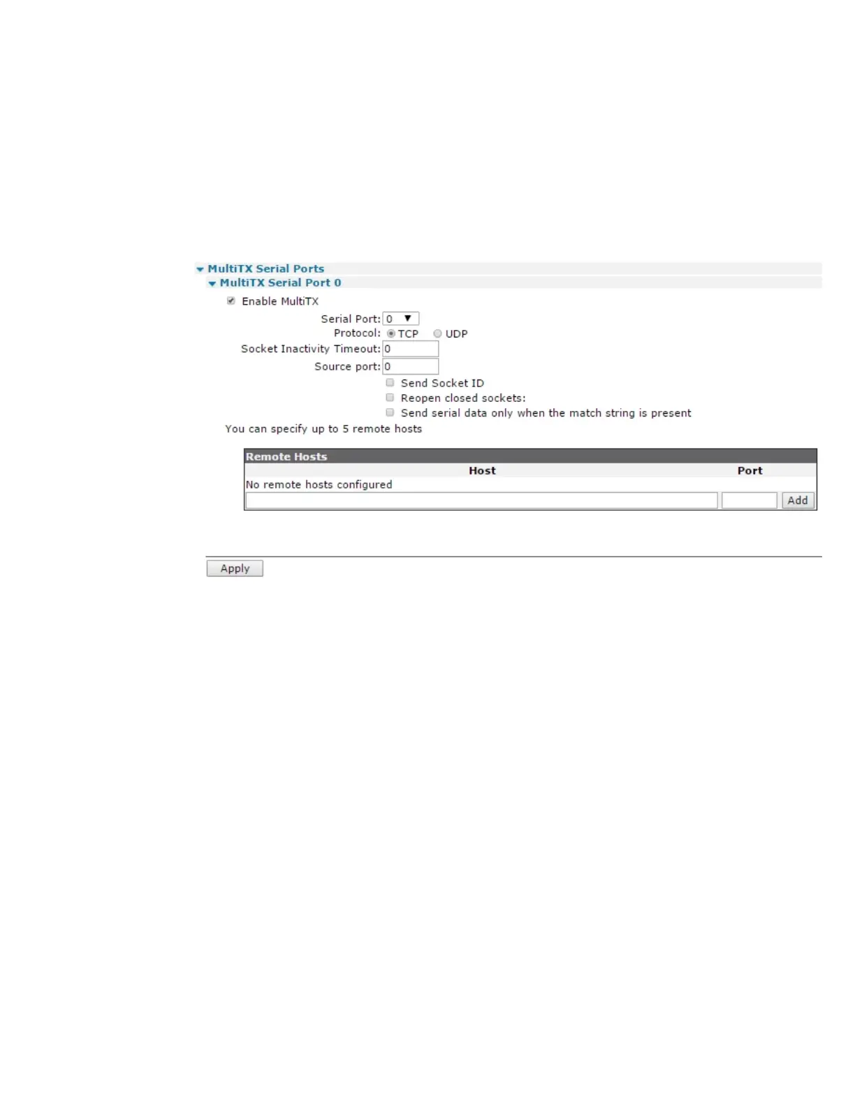 1. Go to Configuration > Network >Interfaces > Serial >MultiTX > MultiTX Serial Port n.