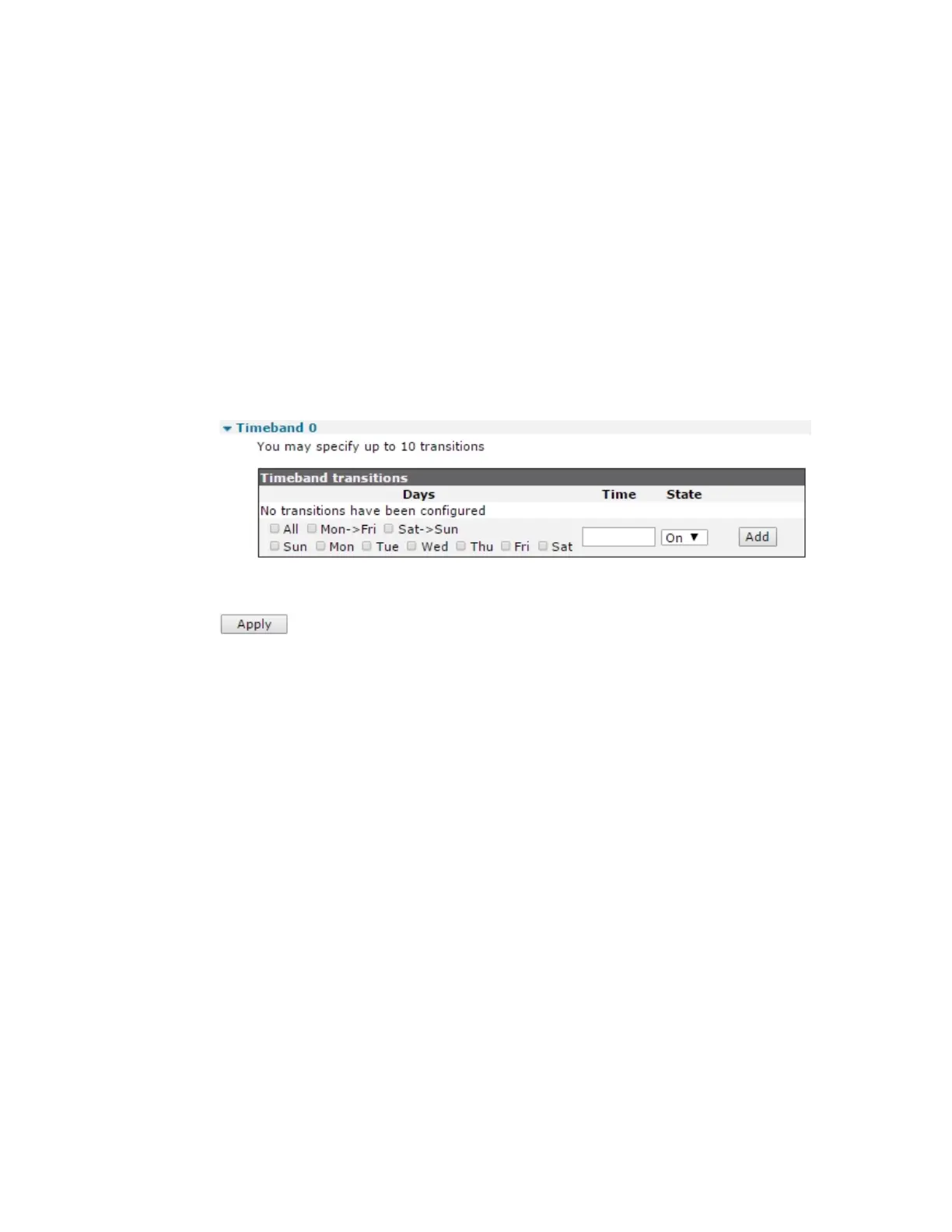 A set of checkboxes for selecting the days of the week to which the time band transitions