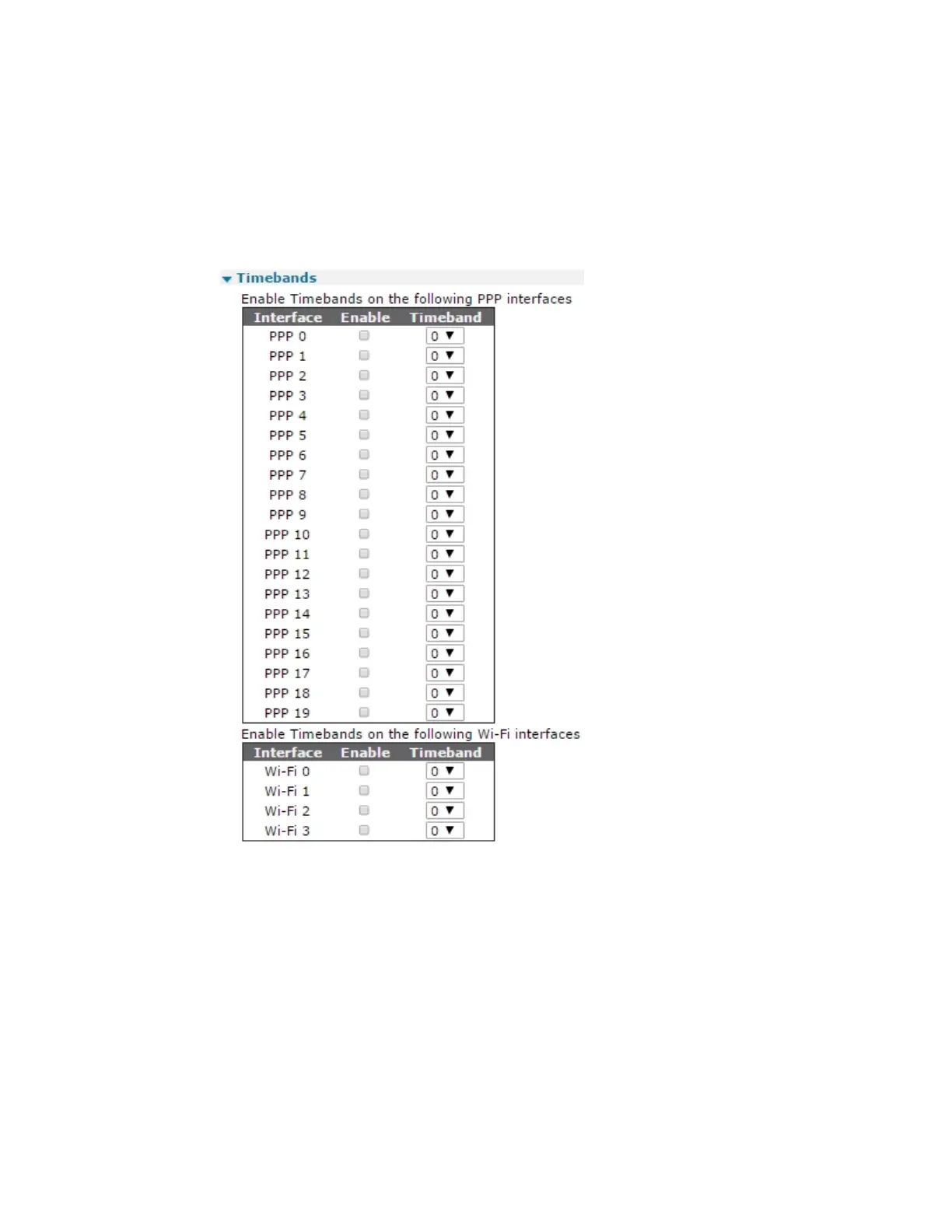 Configuring time bands Enable and disable time bands for a PPP or Wi-Fi interface