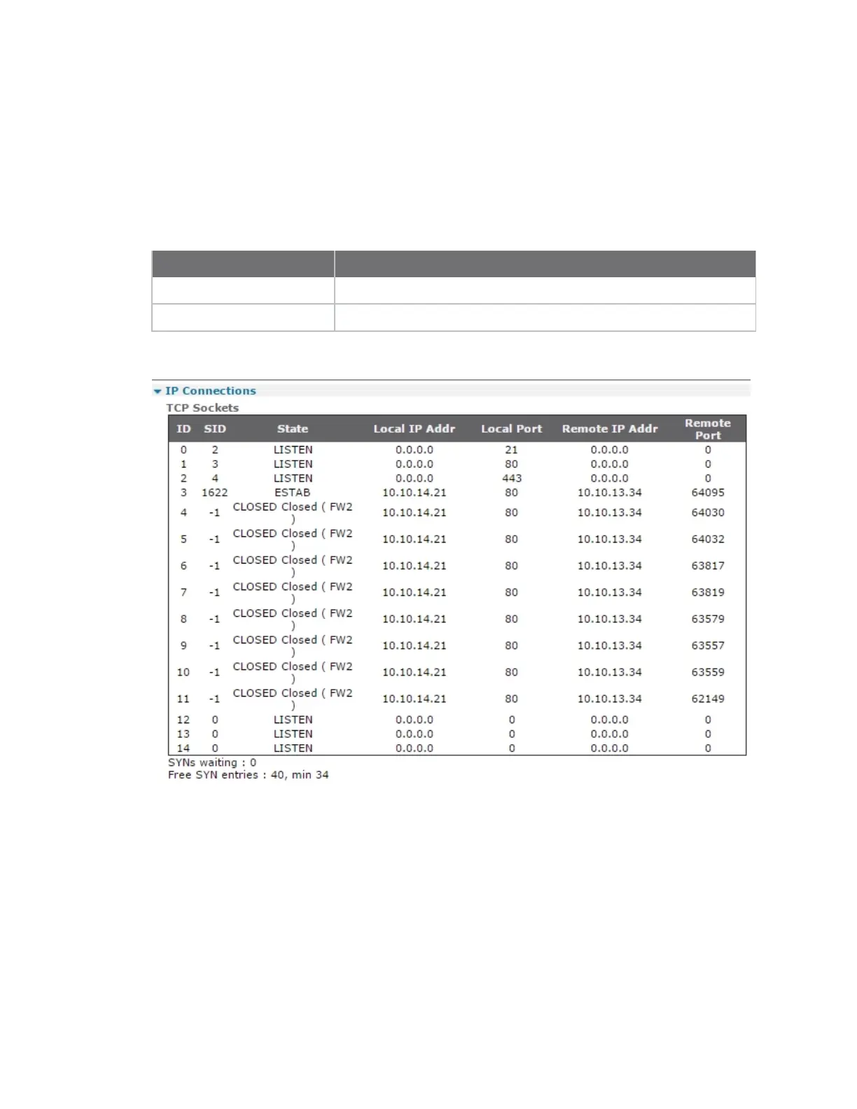 The IP Connections page displays the current status of the TCP sockets on the router.